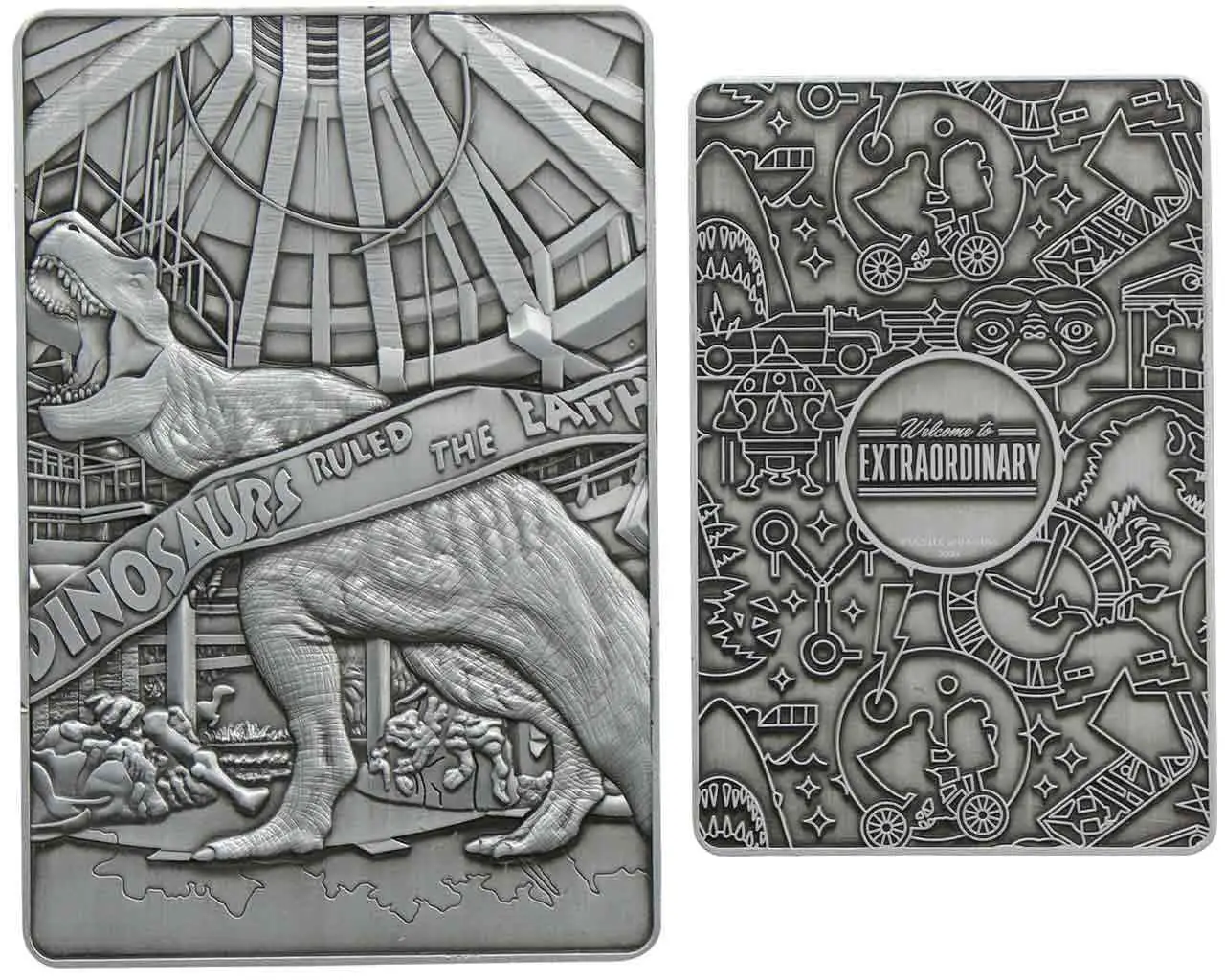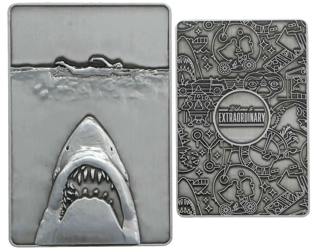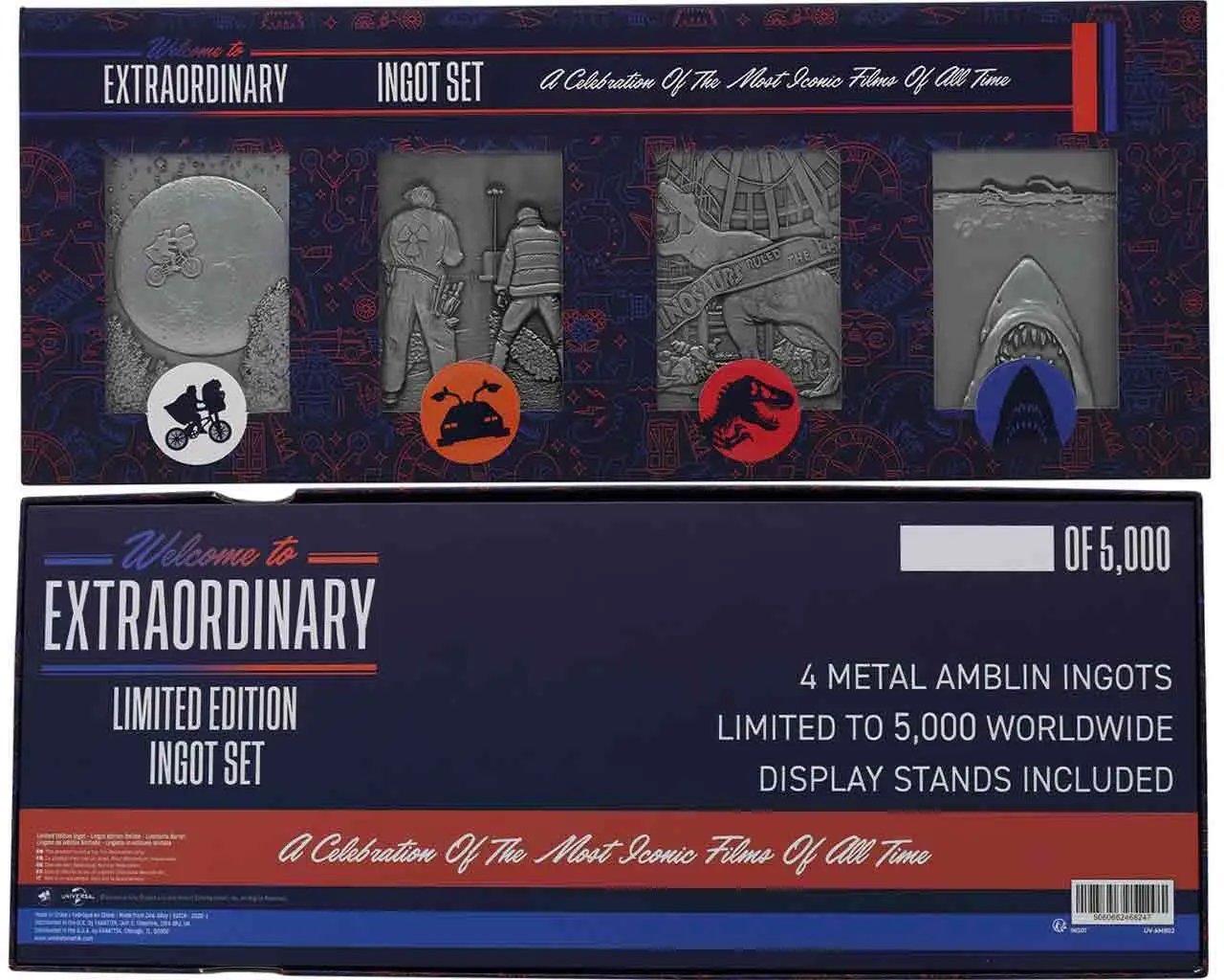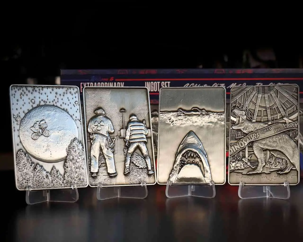 Four heavily embossed metal Ingots featuring Back to the Future, E.T. The Extra-Terrestrial, Jaws & Jurassic Park. All of the Ingots come with individual display stands and the set is individually numbered and limited to 5,000 worldwide.
