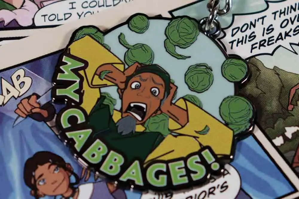 "My Cabbages!" - The Cabbage Merchant is having another streak of bad luck... as he so often does when Aang and 'Team Avatar' are around. To commemorate this lovable Cabbage Merchant, this metal key ring is limited to 5000 worldwide with each is individually numbered.