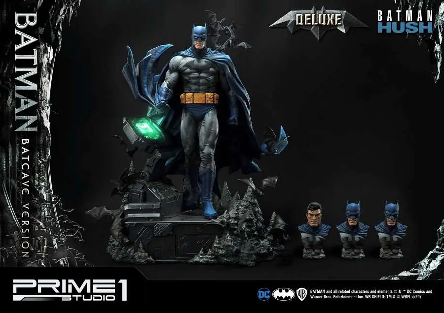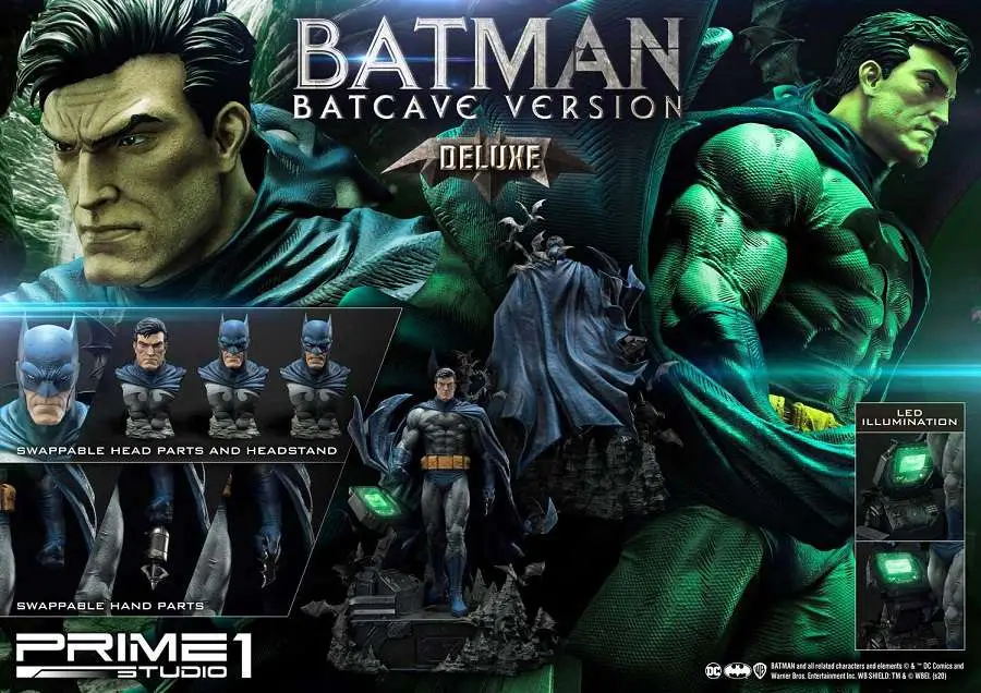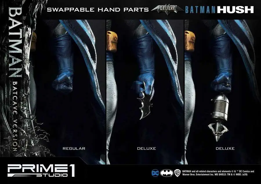 The Batman Batcave Deluxe Version Statue includes in total four alternate Portraits (Normal, Bruce Wayne, Clenched Jaw, Smirk), three Head Stands Bust and three swappable left-hand parts (Grappling Hook, Batarang, Gripped Hand).
