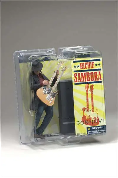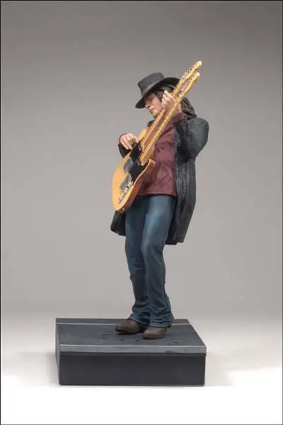 Stands 6 3/8 inches tall at top of hat (6 ¾ inches at tip of guitar neck). Articulated at wrists. Includes 3 ½ inch by 4 3/8 inch deep by 15/16 inch tall custom base.