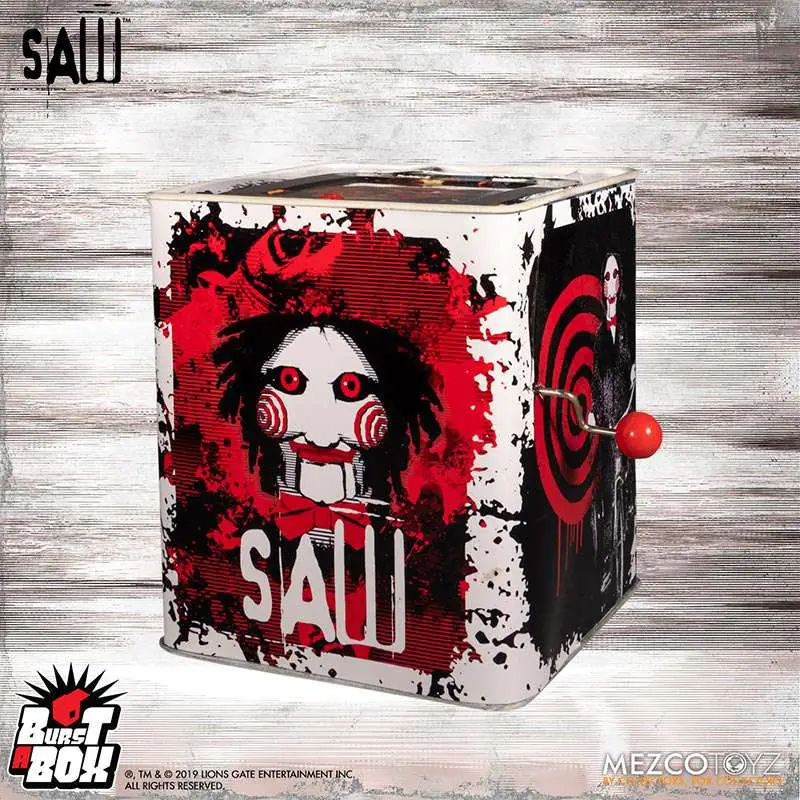 The Saw Burst-A-Box features Billy – the mechanical puppet often used by John Kramer, better known as the Jigsaw Killer.