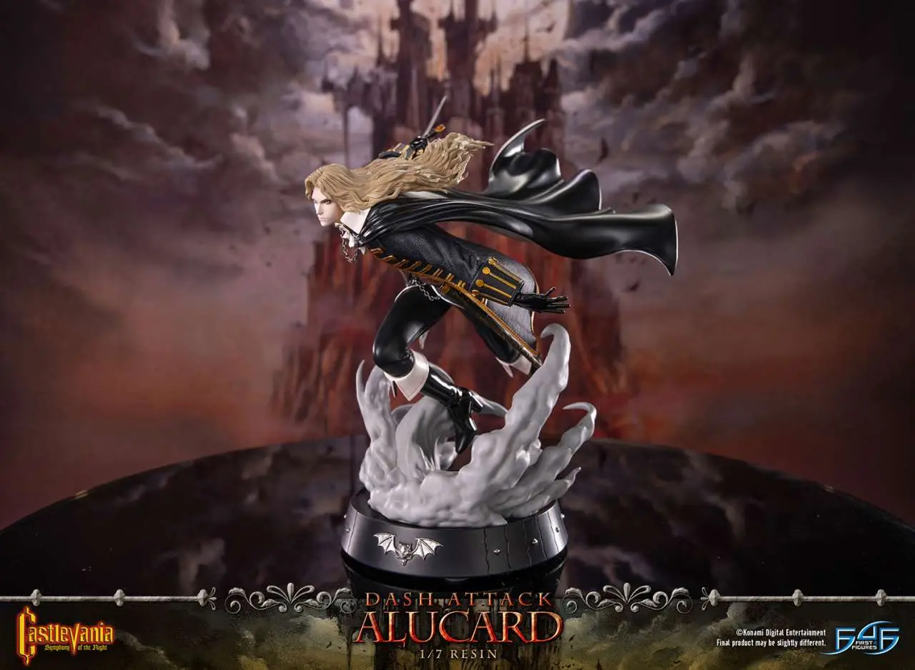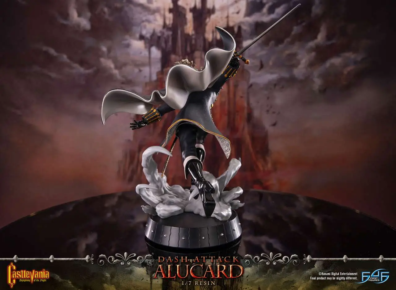 This resin statue features Alucard in a dynamic pose, wielding a sword in his right hand. The statue meticulously captures Alucard's details, from his distinctive attire to his determined expression. The base is adorned with smoke, adding to the atmospheric design.