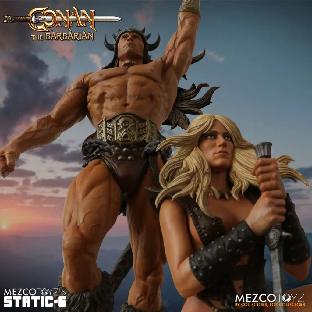 Mezco’s Static Six: Conan the Barbarian statue translates Renato Casaro’s art style into a three-dimensional tribute to his classic film poster: Conan stands triumphantly atop rocky terrain, wielding the Atlantean Sword toward the sky. Ready to strike in his signature helmet and chained gladiator loincloth, Conan is accompanied by the fearless brigand Valeria, who fiercely thrusts her sword into the ground.