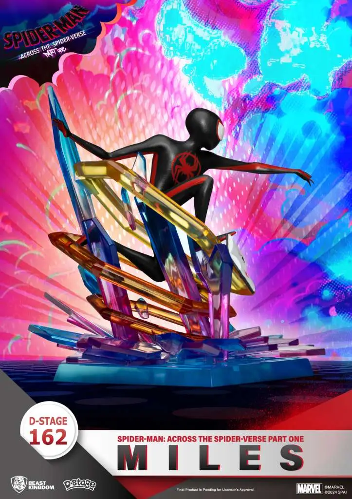 Following the D-Stage release of "Punk Spider-Man" from Earth-138, fans can now enjoy the classic Black and Red costume from Earth-1610, the signature attire worn by Miles. This iconic suit, known for its undeniable coolness, is now brought to life in high-quality 3D form for collectors to proudly display. The base takes cues from the vibrant movie, with a kaleidoscope of colors and shapes popping straight off the base.