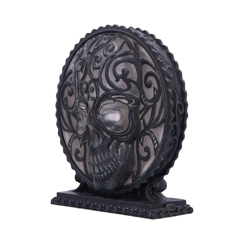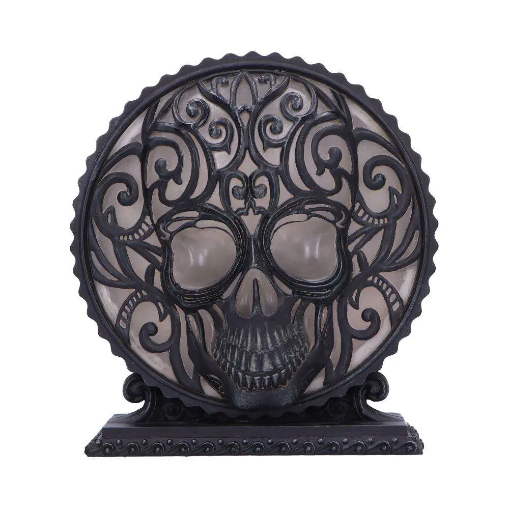 The lamp features a detailed resin sculpture with a soft ambient glow. The centrepiece skull is made up of intricate patterns on a sturdy base.