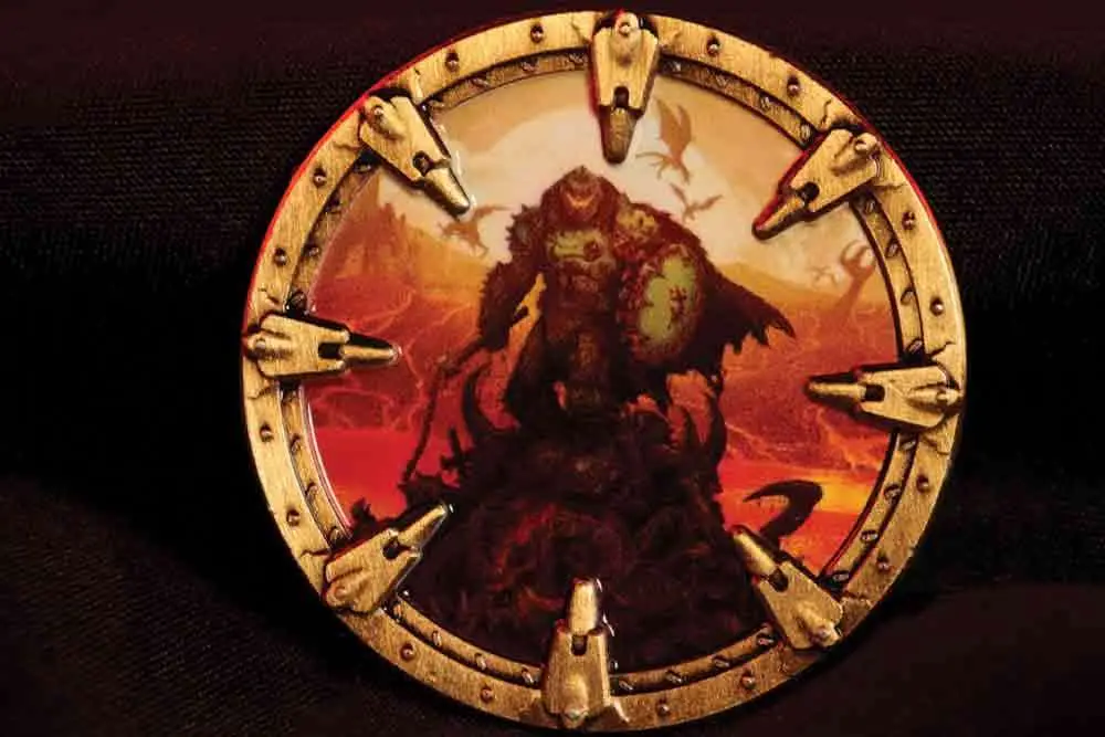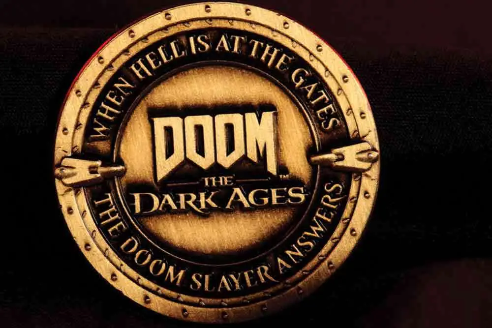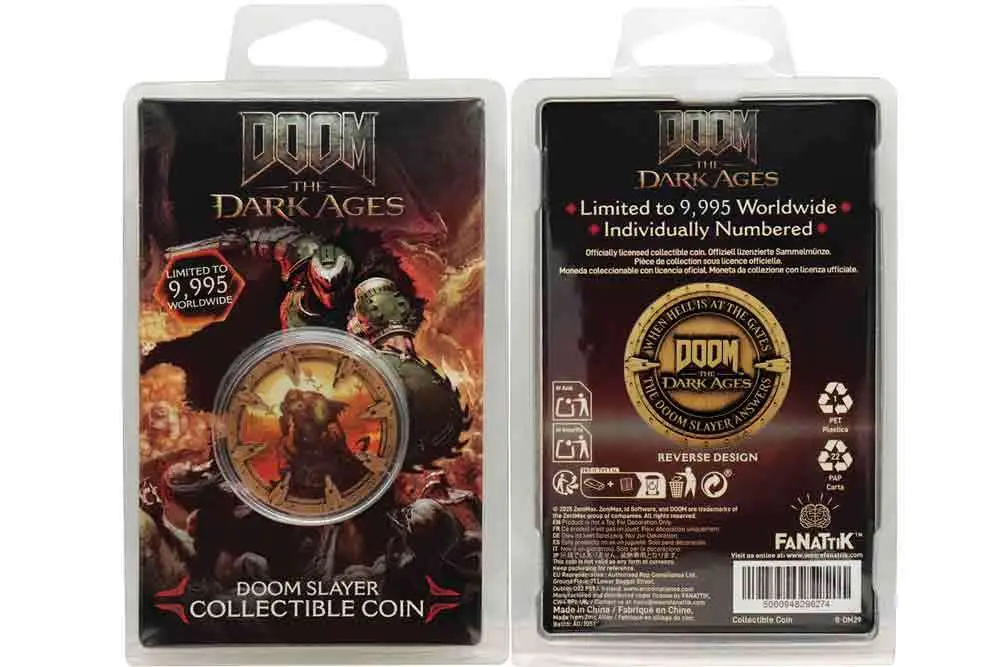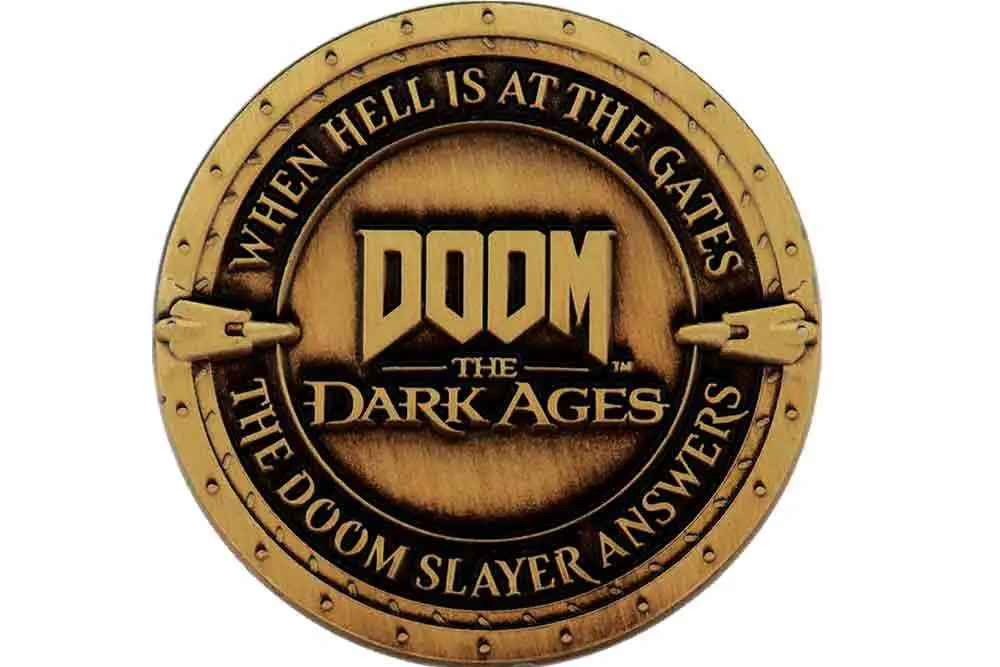 Celebrate the brash and brutal legacy of DOOM: The Dark Ages with this limited-edition collectible coin. Surrounded by a unique shield shaped border, taken from the deluxe edition, this coin’s face features the iconic Slayer in detailed artwork. Now, flip it over and see the Dark Ages logo embossed into the reverse.