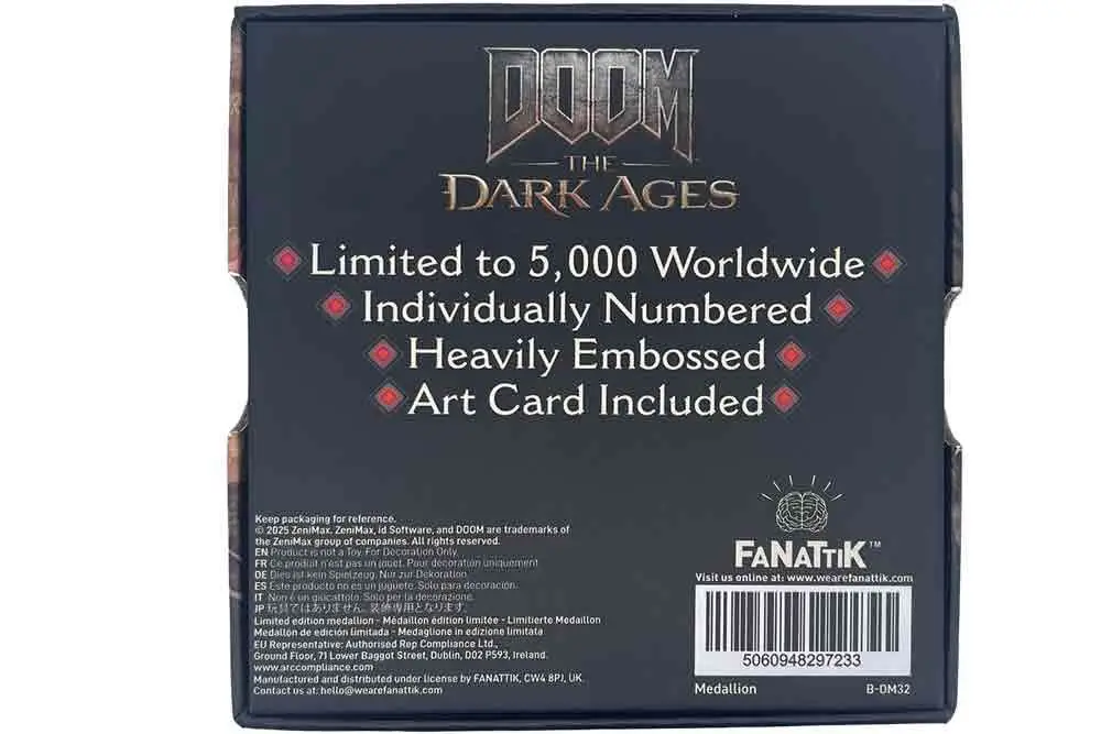 Capturing the raw mechanical menace of the Saw Shield and created as a brutal tribute to one of DOOM’s most fearsome weapons, each medallion is crafted with intricate detail and created with a unique domed shield effect. Ready to serve as a token of your loyalty to the Slayer’s cause, each collectible comes complete with a stand ready for display and a unique art card.