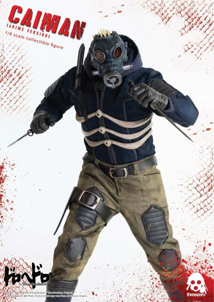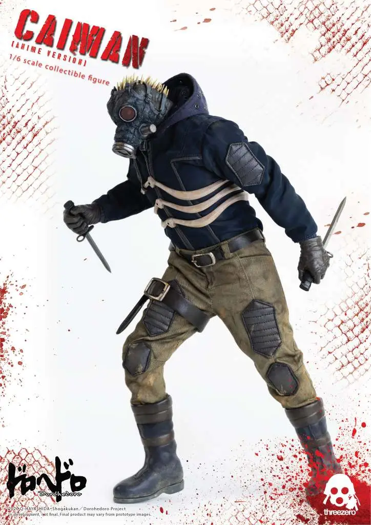 This version of the Caiman collectible dons the anime color motif and stands at approximately 36cm tall. It features two interchangeable heads (a masked head* and a lizard head). There are two interchangeable expression parts for the lizard head (standard eyes and angry eyes). The figure's equipment accessories are two knives with fabric sheathes, and a rib-shaped body armor. The fabric costume includes a hooded wind breaker, a pair of pants, a belt for waist, and a belt for thigh. Other accessories includes a pair of boots and three pairs of interchangeable hands (one pair of relaxed hands, one pair of fists, and one pair for gripping knife).