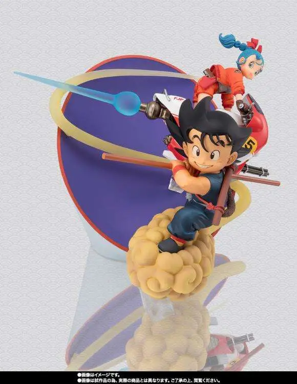 As pictured in the first publication of "DRAGON BALL" in Issue 51 of "Weekly Shonen Jump" in 1984, Son Goku & Bulma are brought to FiguartsZERO! Made in proportion to the size of the magazine at 180mm, this figure doesn't just recreate Son Goku and Bulma...The unique circular background of the magazine cover art makes its way into the figure as a stage. The headlights and cowl of the bike, as well as the cloud tail of the Flying Nimbus and muffler effect parts utilize clear parts to better represent the original artwork. All angles of Son Goku and even the bike have been materialized to create a truly detaled recreation!