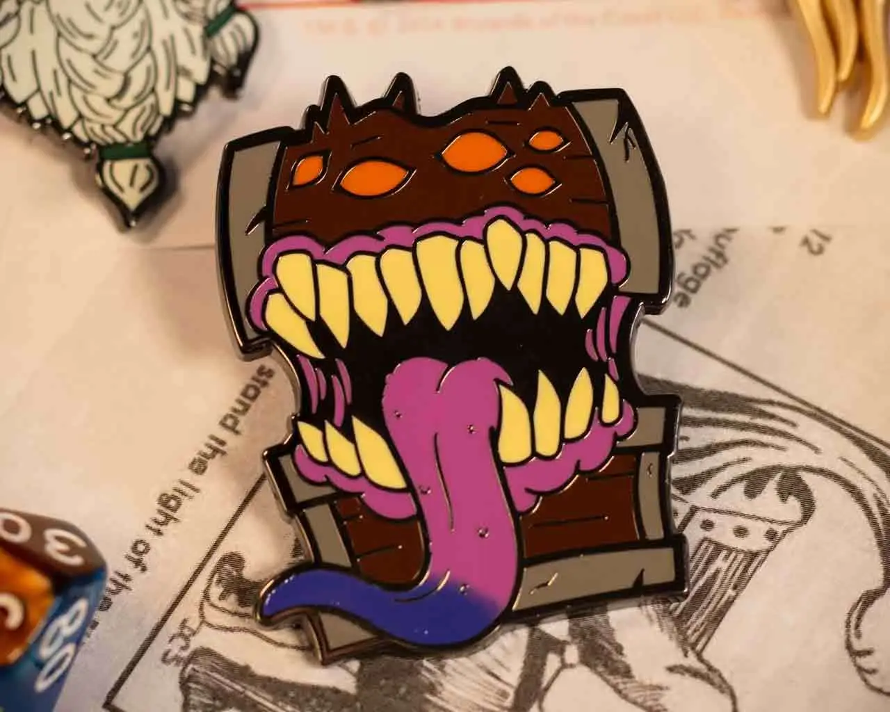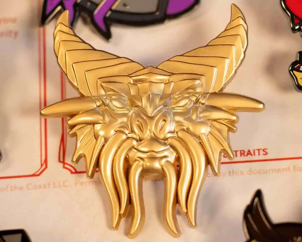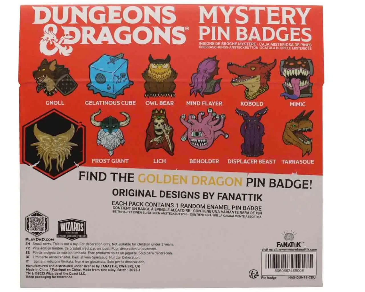 With you all the way from 1974! Celebrate the amazing 50th Anniversary of the Dungeons & Dragons tabletop role-playing game. Join us, be a hero and roll the dice on this CDU containing 12 mystery pin badges. Each pin is metal, enamel and heavily embossed. As well as the possibility of finding a Rare Gold Pin (per each CDU).