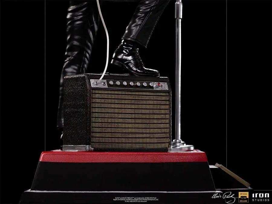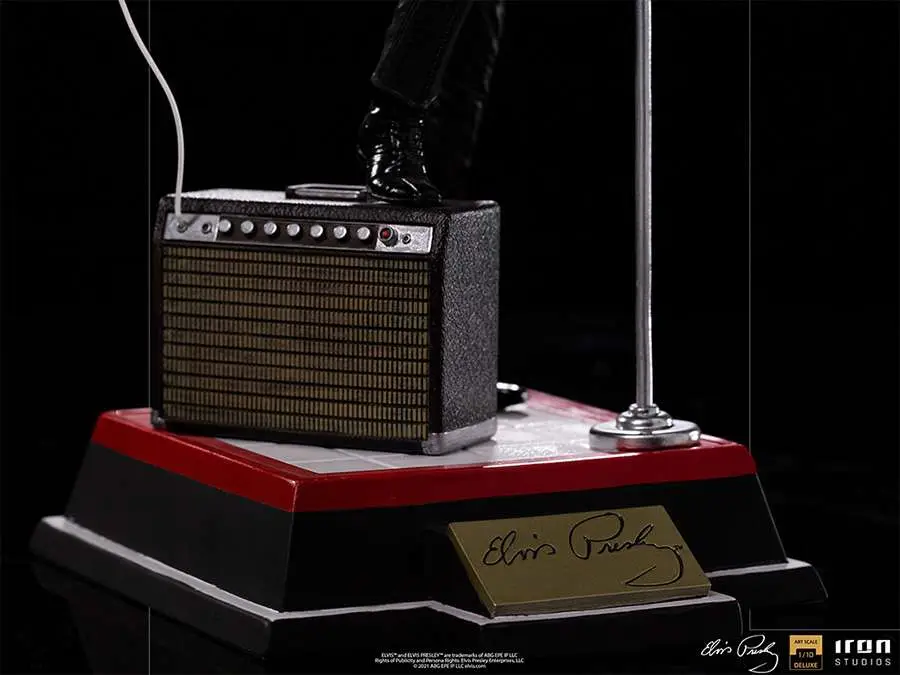On a red and white base, which reproduces part of the real stage of his show, and with his signature on the front, he poses with his right leg on his "Benson 200" amplifier, supporting his semi-acoustic guitar "Gibson Super 400 CES 1963 ". The statue also has a microphone stand with a peculiar round base in front of it. In this way, Iron Studios proudly presents its "Elvis Presley Comeback Deluxe Art Scale 1/10 - Iron Studios" statue, replicating the legendary King of Rock in one of his most acclaimed performances, also the first figure derived from the pop music universe produced by Iron Studios.
