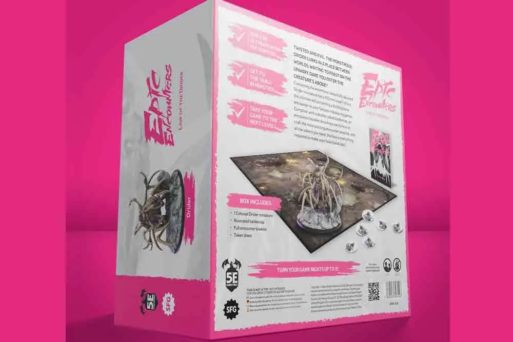 Bursting to be unleashed, this 5e-compatible Epic Encounters boss box contains all the tools a Dungeon Master needs to wreak havoc in your next roleplaying campaign:Intimidating 100mm Drider miniature, 1 Double-sided illustrated battle map, 1 Adventure book, all the tokens you need to play