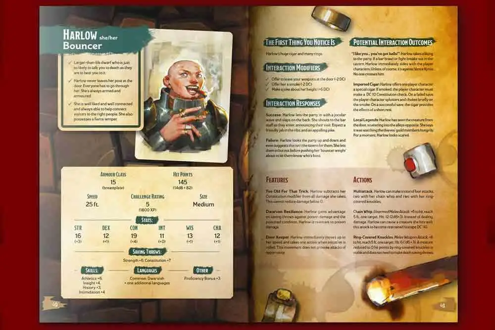 Taverns are a frequent feature in almost every fantasy roleplaying campaign, yet they’re rarely given time to shine. That ends now. Your party’s tavern visits will no longer be a means to an end. With this 5e-compatible kit, you can make every tavern encounter epic, whatever your level of experience — with minimum effort!