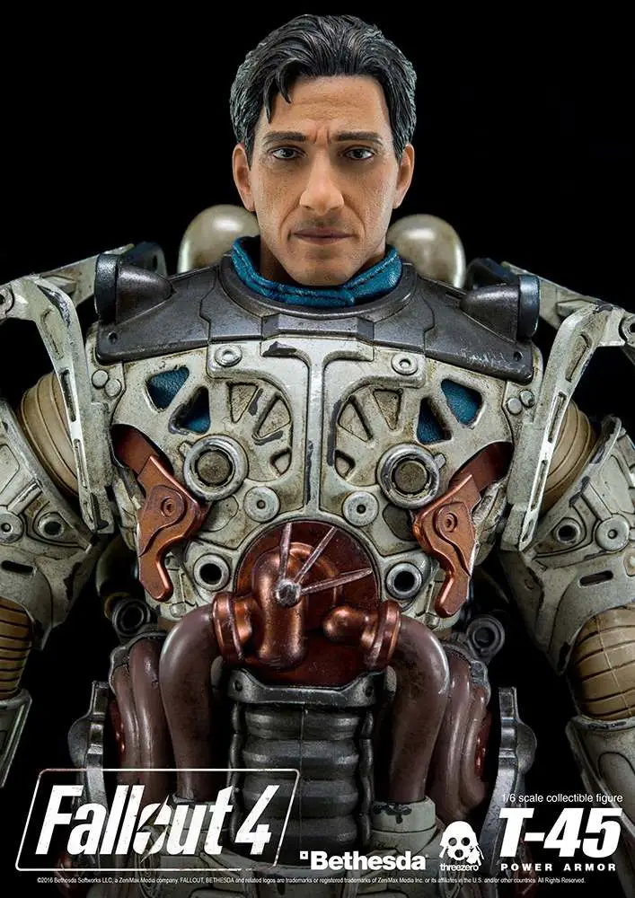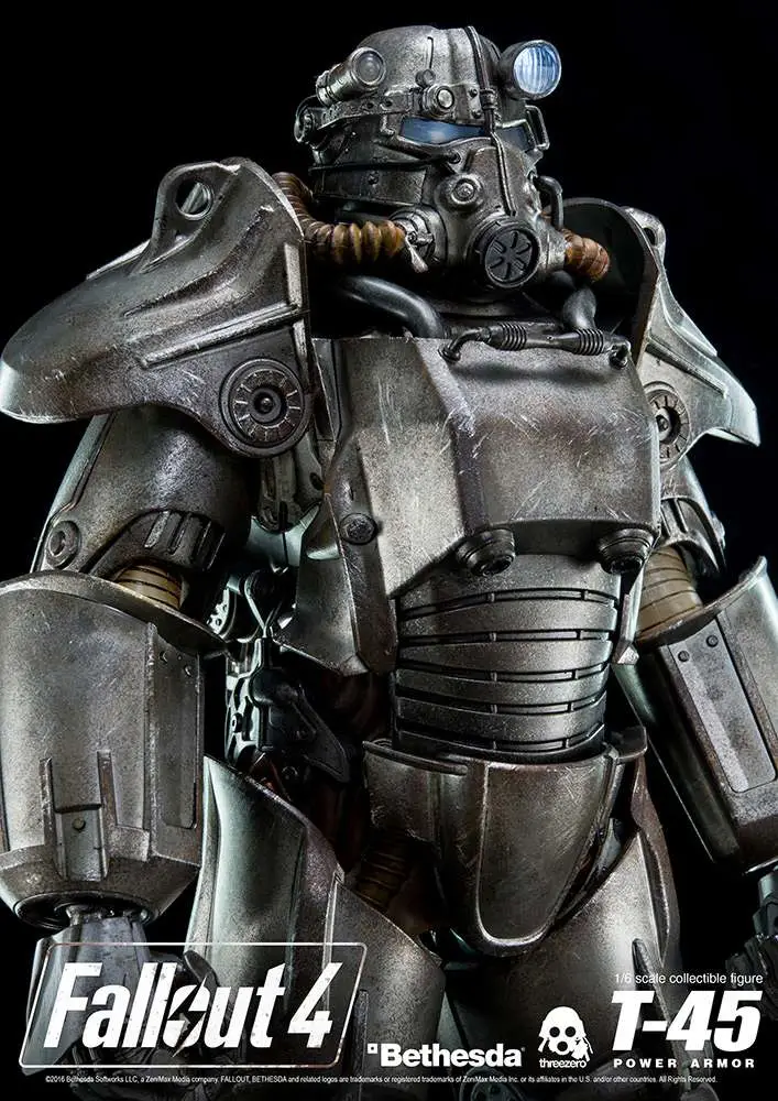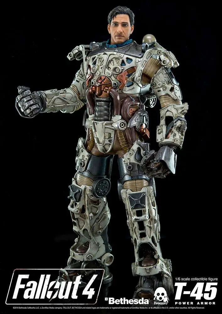 Threezero is glad to announce the T-45 Fallout 4 Collectible Figure. The T-45 stands approximately 14.5 inches tall with incredible details and over 35 articulated parts. Featuring an interchangeable male head and helmet that includes LED light-up functions. All outer-armor pieces are detachable and weathered with incredible paint application based on the appearance in the video game.