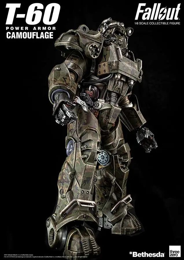 Fallout – 1/6 Tâ€60 Camouflage Power Armor is a fully-articulated collectible figure, its pieces are completely interchangeable with all previous threezero 1/6 Fallout figures.
