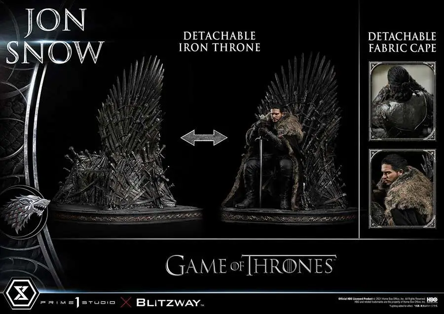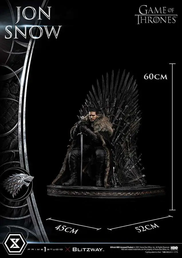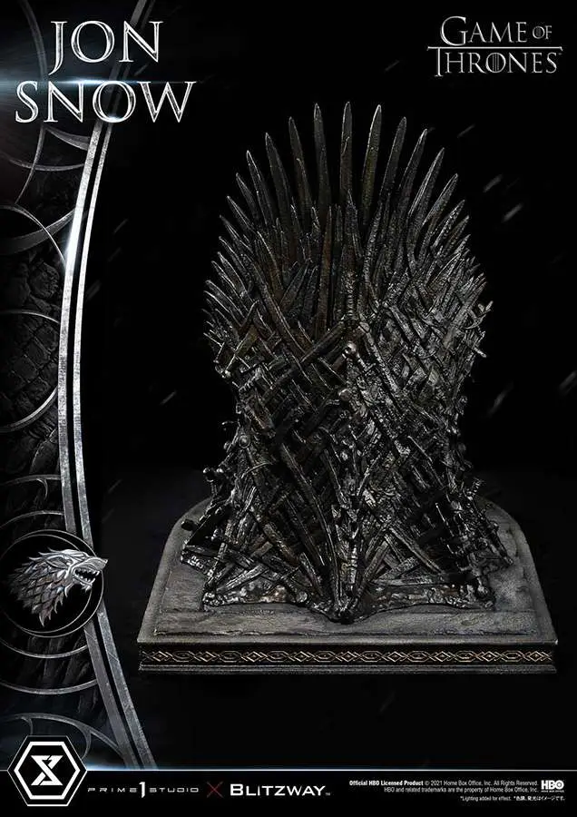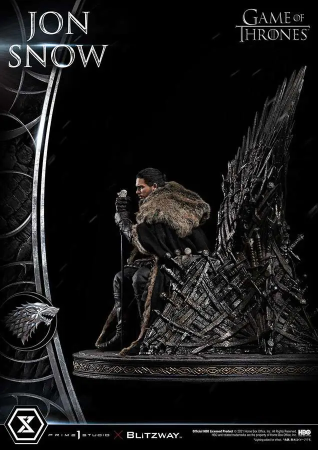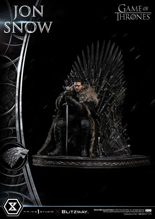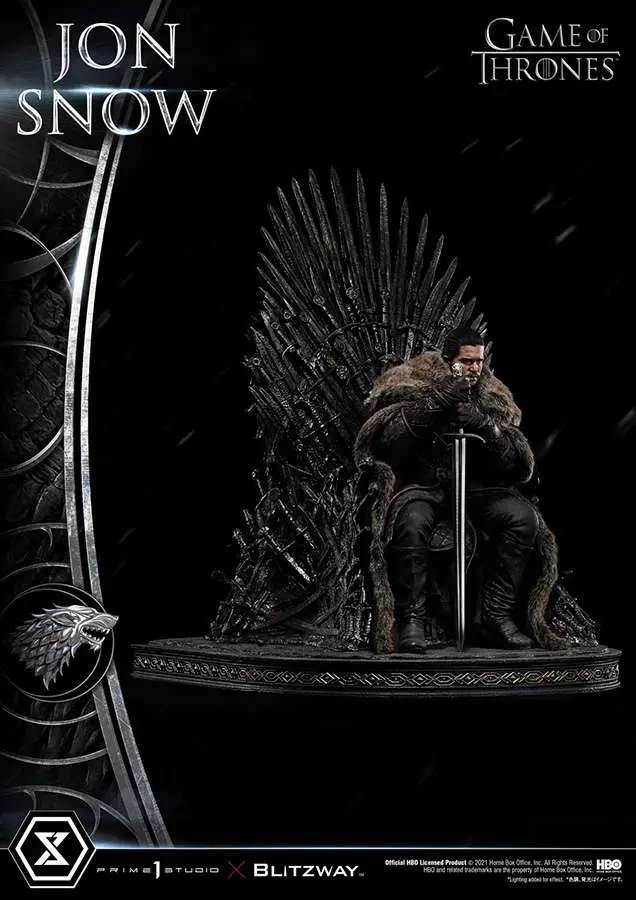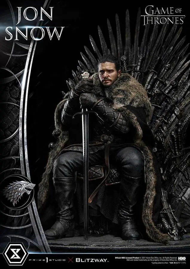 He’s known by many names: The Bastard of Winterfell, Lord Snow, The White Wolf...Aegon Targaryen. But Lord Crow worked his way into our hearts and minds as Jon Snow, bastard son of Eddard Stark, King in the North. And finally, Prime 1 Studio, in collaboration with Blitzway, brings him to you in all his brooding moodiness. Although seated at 24 inches tall, this Game of Thrones masterpiece demands to be displayed in a central place of honor. In this statue, the Warden of the North sits uneasily on the Iron Throne, resting his grip on his mythical sword of Valyrian steel, Longclaw: Lord Commander Jeor Mormont’s present to Jon for saving his life.