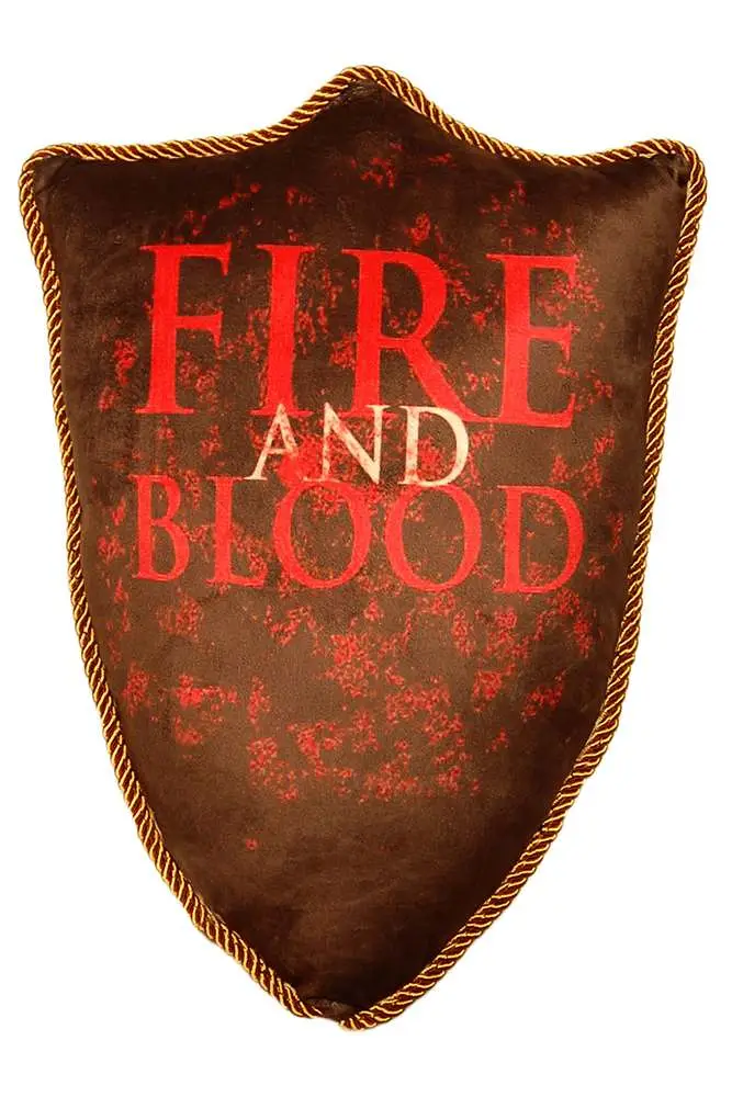 These luxurious soft velveteen pillows measure 22" x 14" x 6" and are shaped like heraldic shields. They feature the Sigil of a Great House of Westeros on the front and the house motto on the back with an antique gold gilded rope trim on the edge.