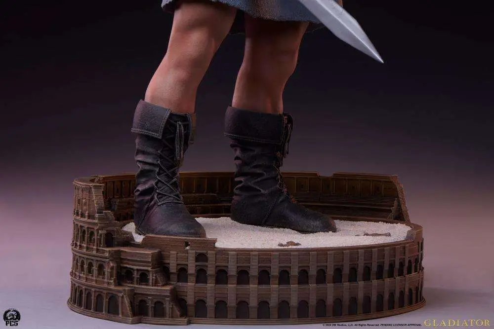 Maximus stands atop a colosseum base, a fitting setting for this noble soldier turned enslaved gladiator. The colosseum base features realistic sand textures, ornate architectural details throughout and replicas of Maximus’ hand-made figurines in the sand.