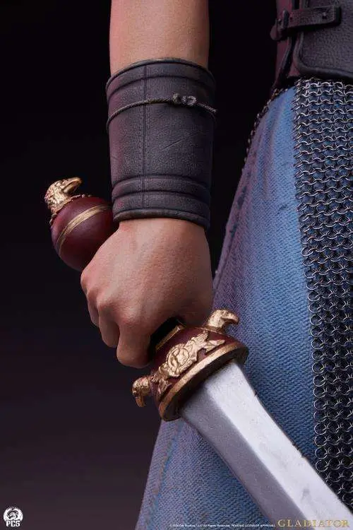 Standing approximately 26” tall this classic combatant is fully sculpted, capturing every detail of his iconic armor and humble blue tunic beneath. Maximus also features real metal chainmail accents adding an extra level of realism to this beautiful collectible. Painstakingly sculpted textures are present throughout with additional weathering details on his armor and boots to really bring this cinematic warrior to life. In his right hand is a traditional Roman sword with ornate gold accents on the hilt and pommel.