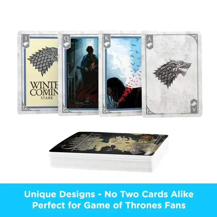 This Game of Thrones deck of playing cards includes 54 cards (52 playing cards and 2 jokers). Every single playing card features its own distinct Game of Thrones themed design and art. No two cards are alike