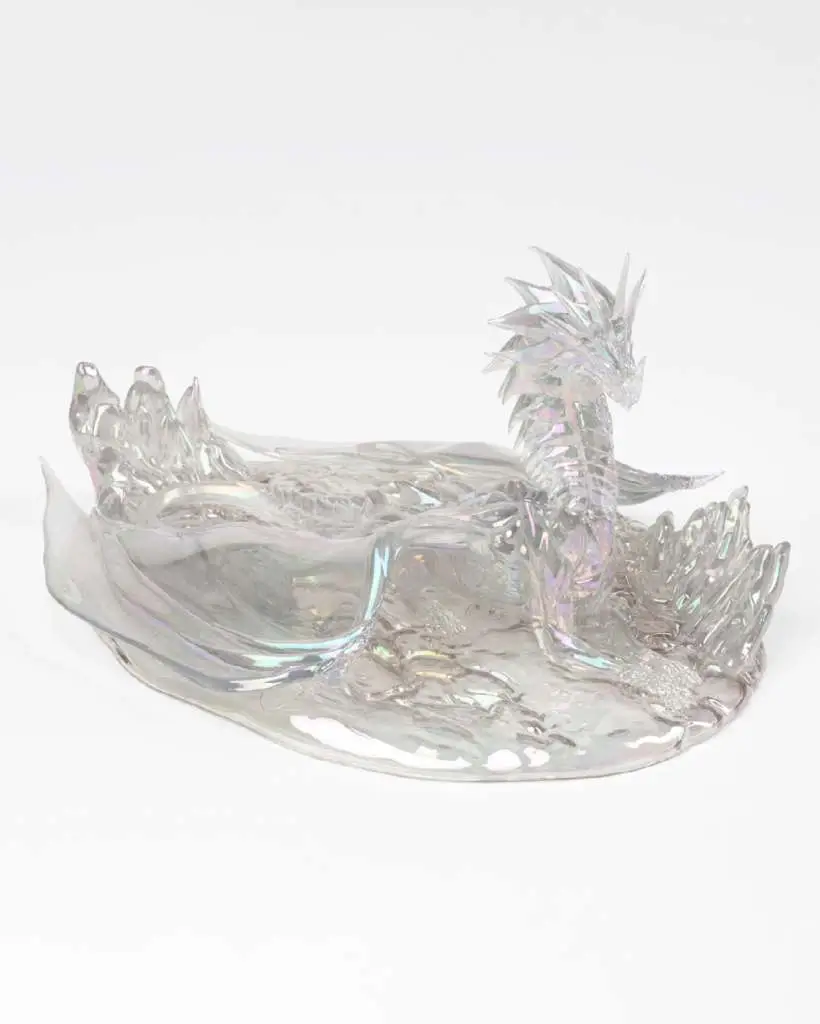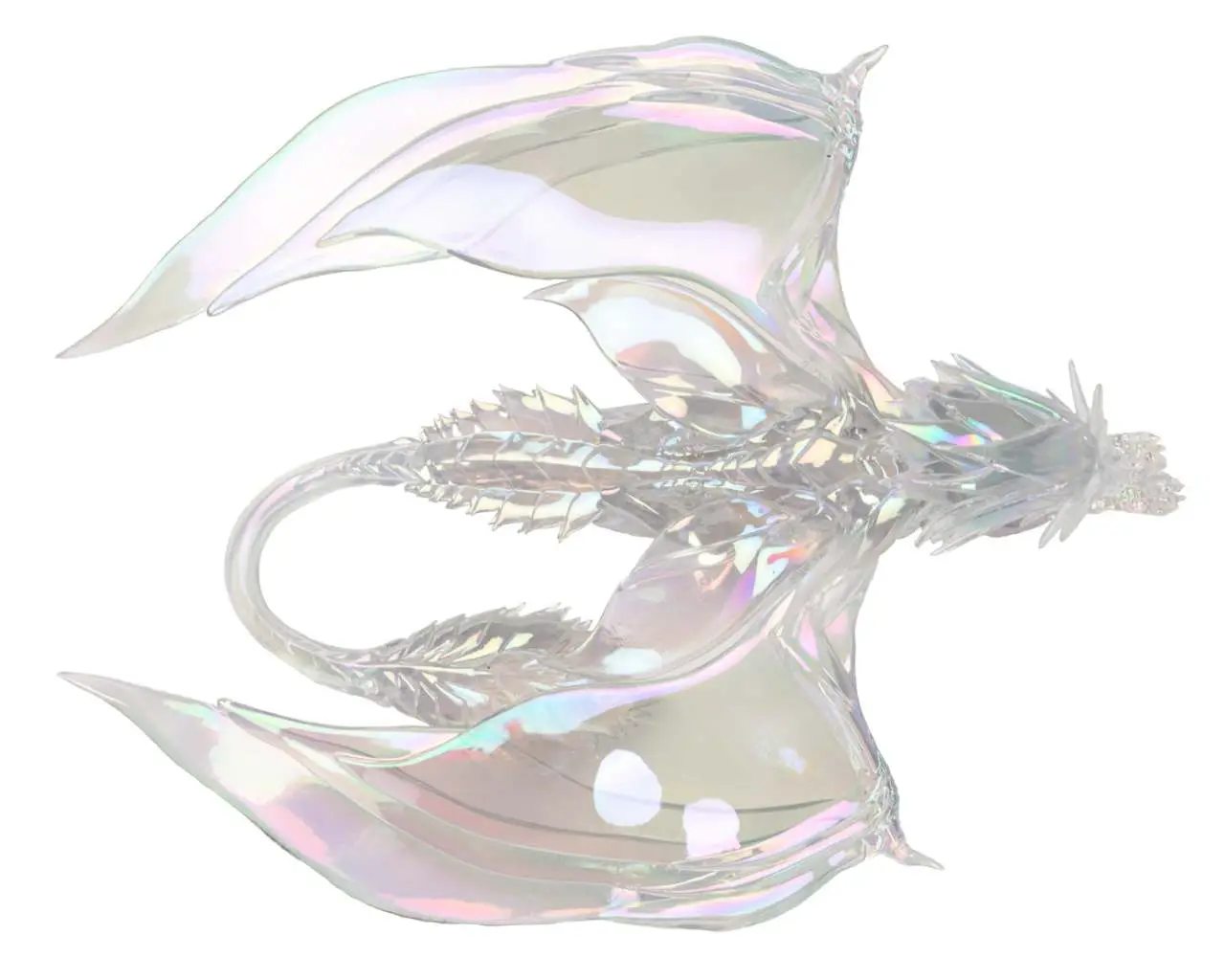 The statue of the Elder Dragon has been produced in the complex "vacuplate" process to give the statue the crystalline, transparent look known from the game. Depending on the incidence of light, the surface shimmers in different colors and conveys the graceful and mystical character that Aurene also has in Guild Wars 2.