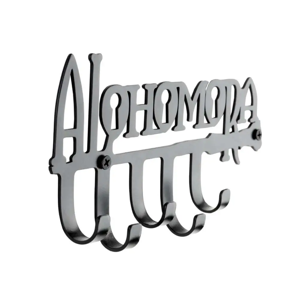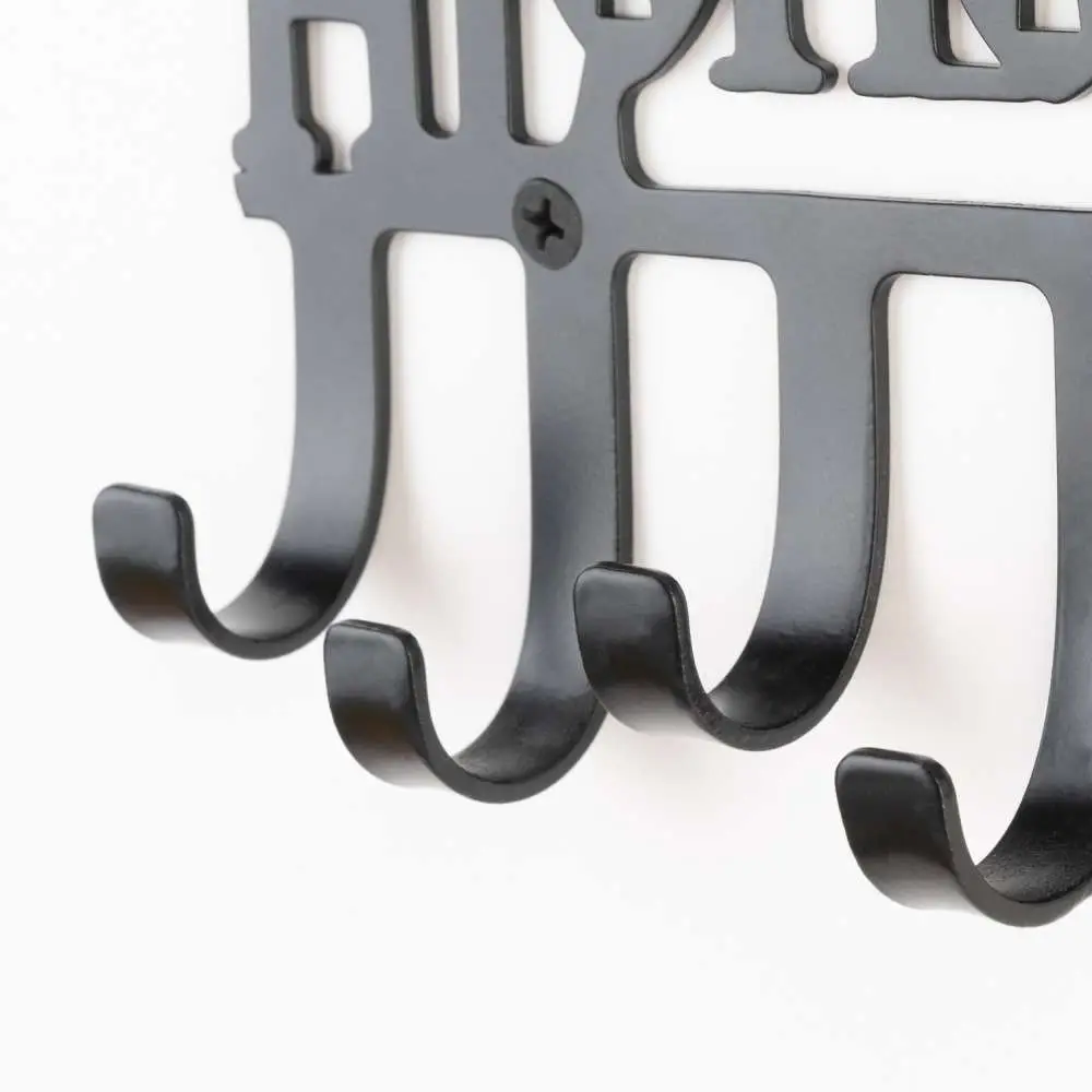 Key rack made of iron metal, with five hooks of varying heights positioned at the bottom.