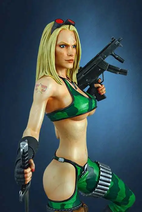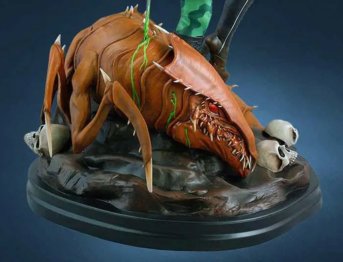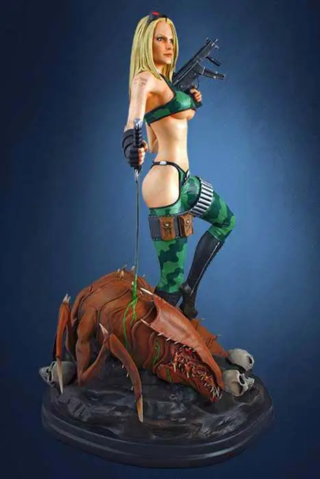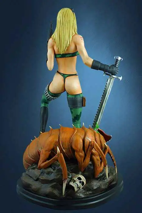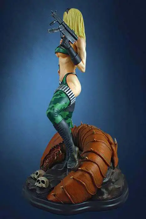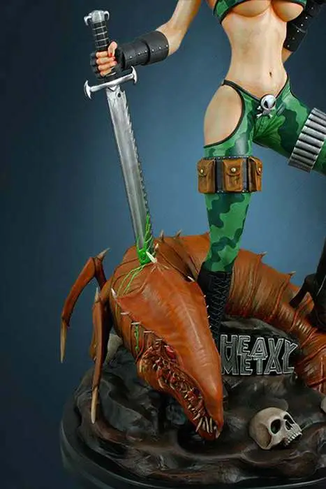 Inspired by the cover artwork from the Summer 2004 edition of Heavy Metal Magazine by James Ryman, this sexy mercenary is depicted gun in hand, standing over the Alien Creature she has just Exterminated with her sword. The highly detailed base features the slain Alien oozing green blood & is littered with the skulls of some of its earlier victims.