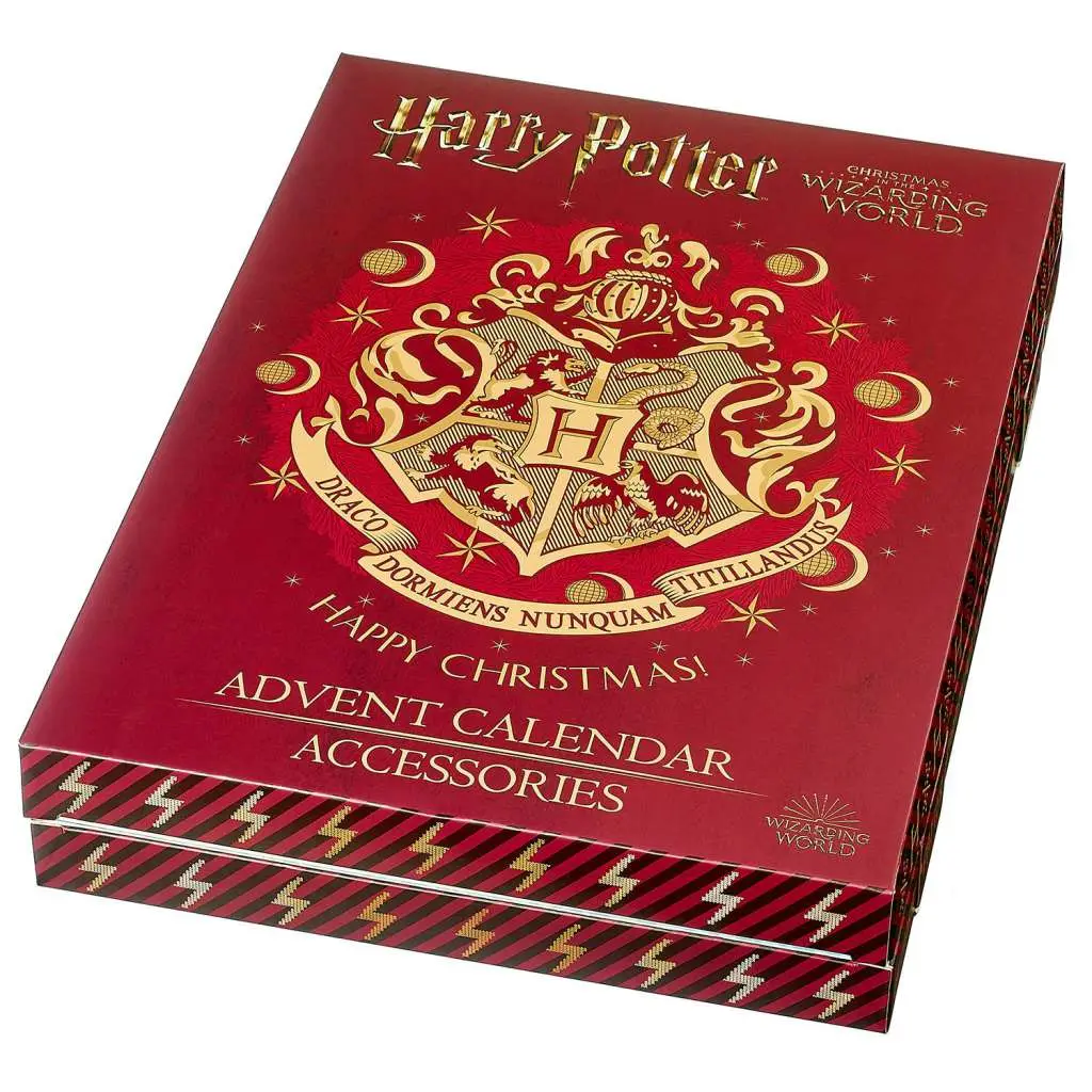 Official Harry Potter 2019 Accessories Advent Calendar with 24 items include a selection of pens, keyrings, bookmarks, pin badges and button badges.