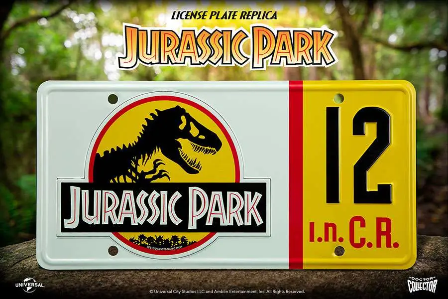 The plate is a replica of the plate found on the front of Dennis Nedry's vehicle in the classic Jurassic Park movie.