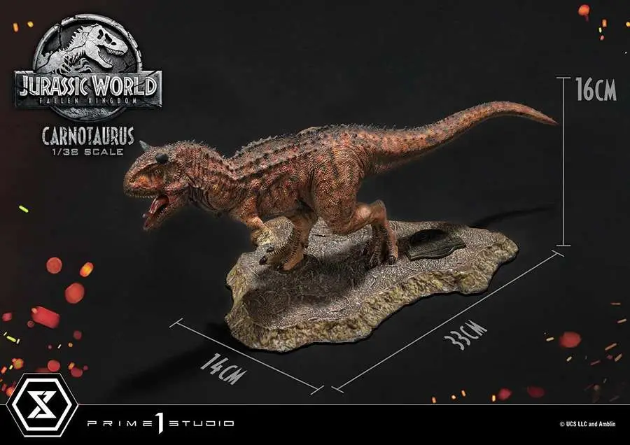 2018’s Jurasic World: Fallen Kingdom introduced us to a new challenger to the T-Rex’s title: the freasome Carnotaurus! With its name derived from the Latin “carnis” (flesh) and “taurus” (bull), this horned carnivore was a sight to behold at the climax of the film. Possessed of sharp horns above its eyes and an armored skull meant for high-impact blunt force, the Carnotaurus was also one of the fastest large therapods. Carnotaurus is scaled perfectly, at 6 inches, with Tyrannosaurus Rex (PCFJW-01) so you can recreate their conflict at the end of the film. Prime 1 Studio artisans have sculpted the intricate scaling, teeth and spikes with utmost craftmasnhip. They have spared no effort in recreating the Carnotaurus’ muscular anatomy. Its coloring is distinctive with its contrasting striping. Satin finishing envelops the entire body with a gloss coat finishing its monstrous eyes, teeth and talons.
