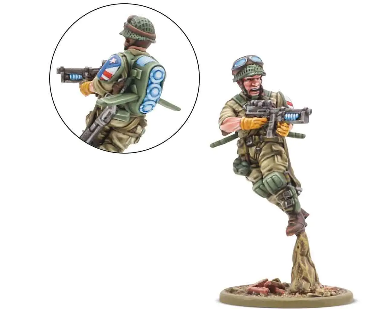 Contains: 1 Warlord Resin United States Platoon Commander (Exclusive to this set), 12 plastic Firefly Airborne Infantry, 2 plastic M2A5 Linebacker Jump Walkers, 1 plastic M5 Stuart with resin upgrade kit, 6 Konflikt ’47 olive Order Dice, 6 Konflikt ’47 green Rift Dice, Waterslide transfer sheet