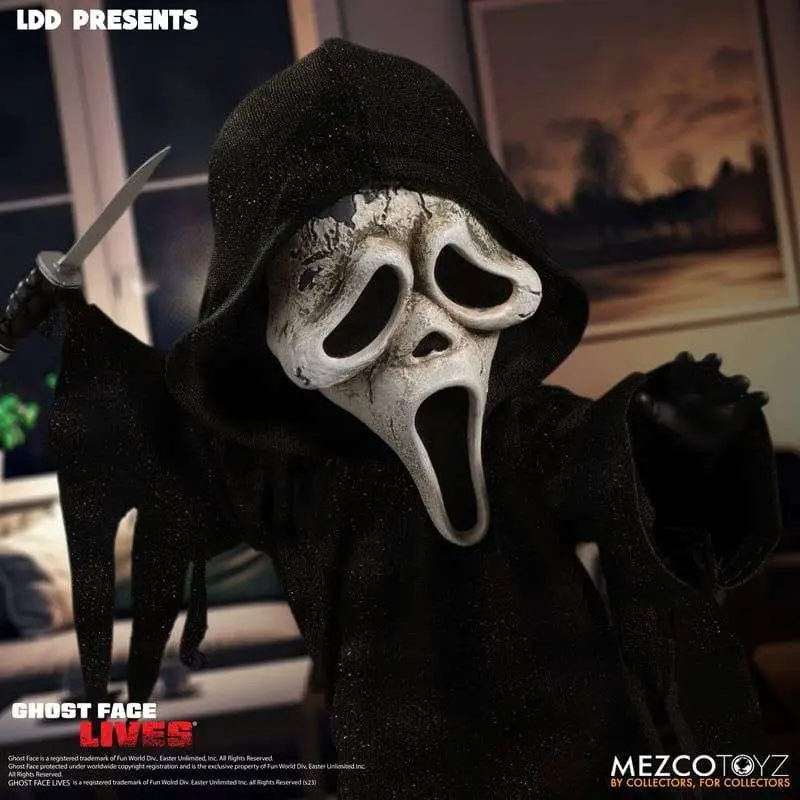 Ghost Face - Zombie Edition features a brand-new head sculpt, showcasing a cracked ghost mask that adds an extra layer of terror. The mysterious killer returns in his signature black hooded robe, swinging a hunting knife in his right hand, ready to strike fear into anyone and everyone.