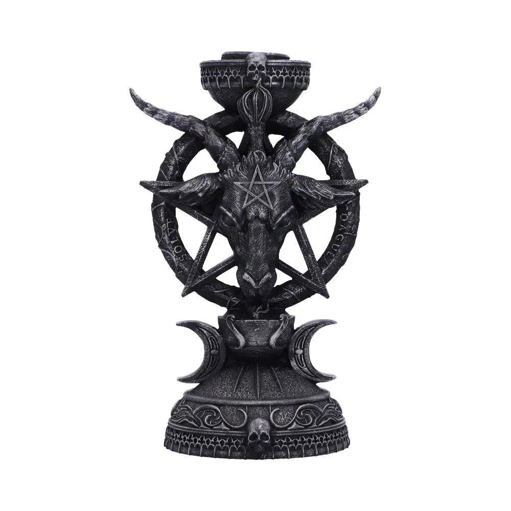 "This candle holder represents a pentagram with the head of Baphomet on it. Above the head is a small bowl, perfect for your favourite scented candles. At the base of the holder, on the other hand, various Gothic symbols and images are visible.