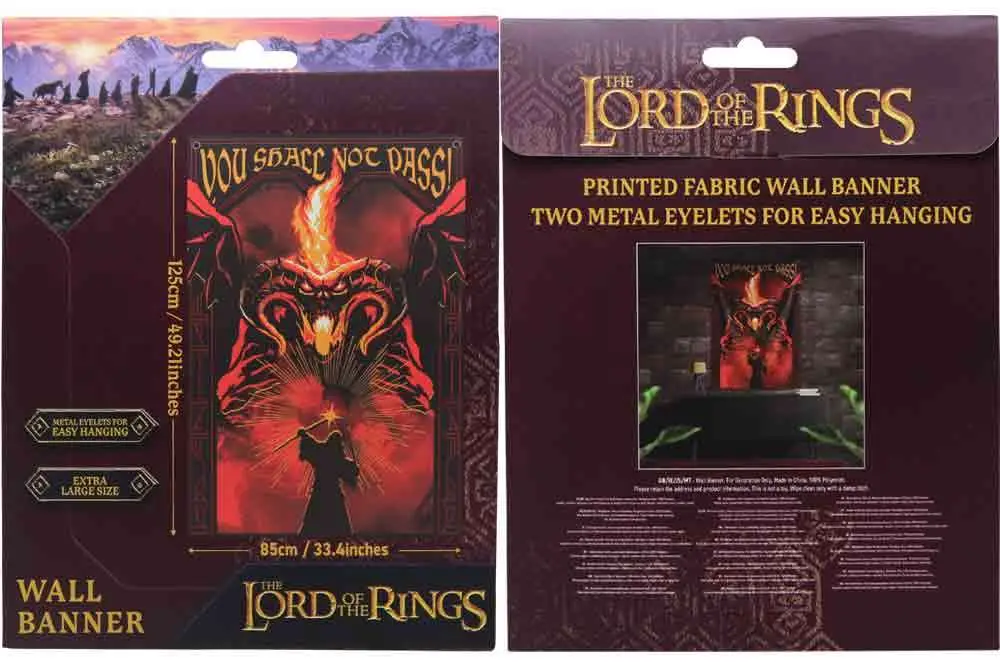 ‘You shall not pass!’ Designed from the perspective of the rings fellowship, the legendary battle between Gandalf and The Balrog is captured on this large wall banner. Each banner measures 125 x 85cm and includes metal eyelets for easy hanging making them an effective way to personalise your space.