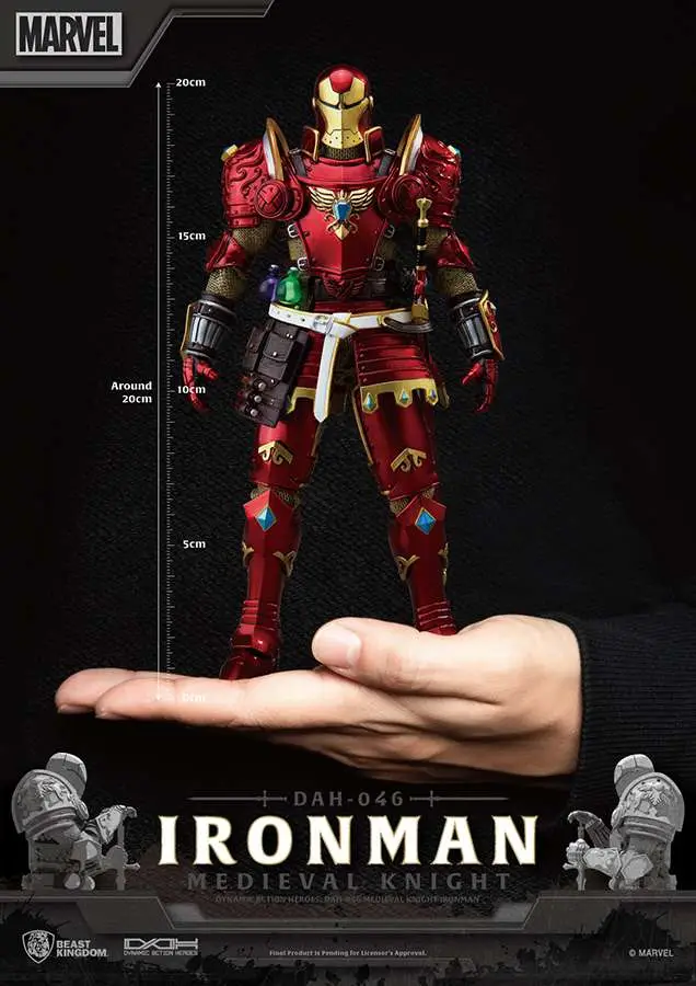 The latest DAH line-up is a new take on classic icons of Marvel Super Heroes with the initial release of the Iron Man DAH-046 and DAH-046DX medieval knight cross-over. Combining the technologically advanced Iron Man suit with a noble European medieval knight's armour, this unique mashup of old and new is an exclusive design from the minds of Beast Kingdom.
