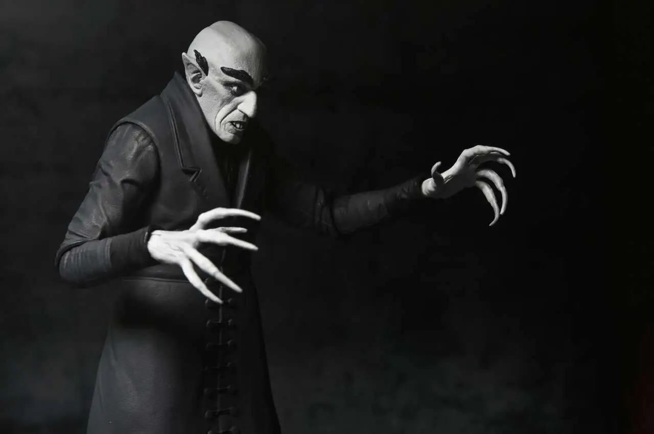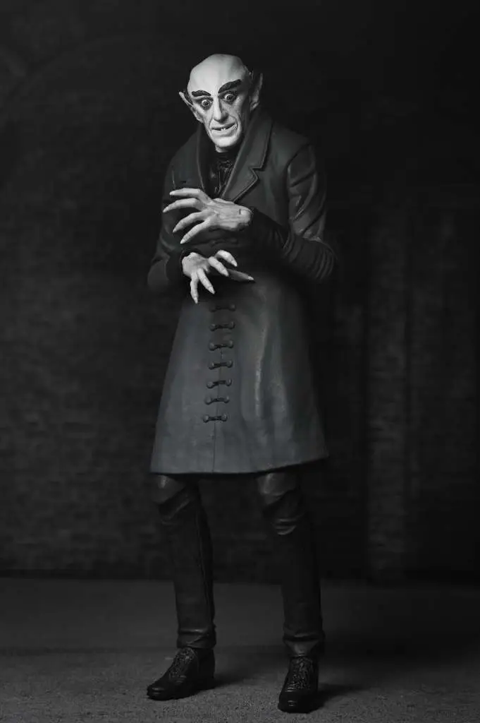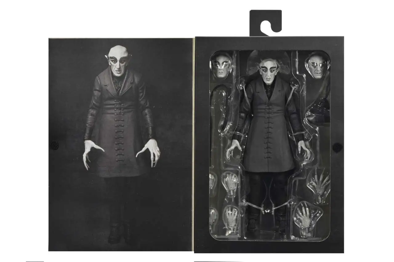 The 1922 vampire film Nosferatu is considered an influential masterpiece of the silent era, and over 100 years later it still holds a place in the imaginations of horror fans everywhere. Presented in movie-authentic black and white, NECA’s Ultimate Count Orlok action figure presents the eerie count in sensational style, with details and accessories carefully sourced from the film. This gothic figure is fully articulated and includes 3 interchangeable heads and a variety of different hands for endless poses. Accessories include hat, whip and soft goods cloak. Comes in display-friendly window box packaging with opening front flap.