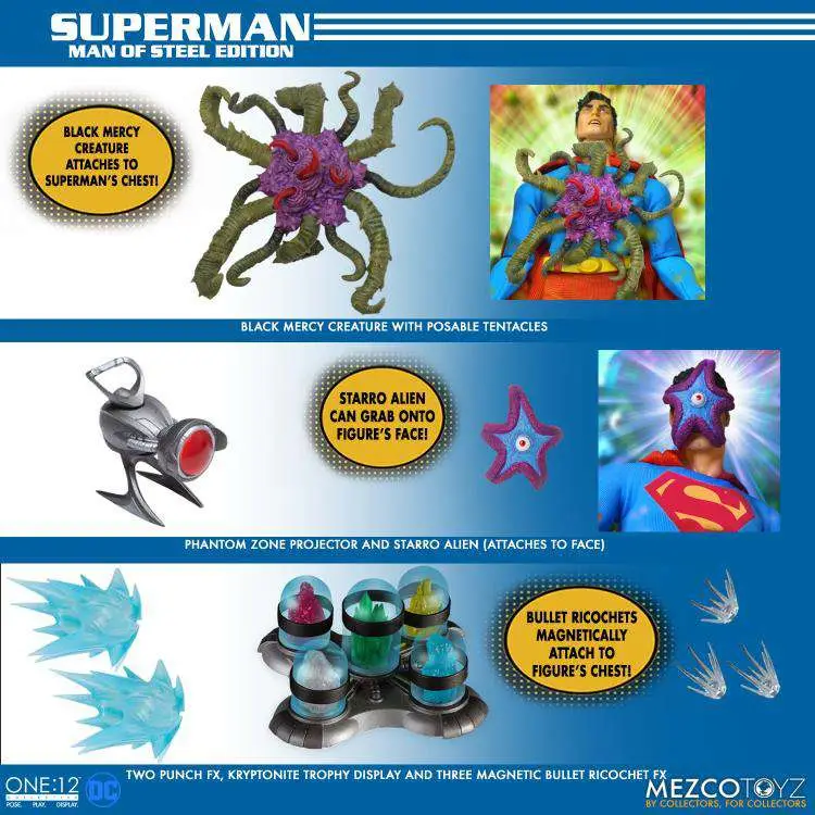 The Last Son of Krypton comes complete with a Phantom Zone Projector - used to send the most dangerous criminals in the galaxy into the Phantom Zone, two punch FX that attach to his hands, three magnetic bullet ricochet FX that attach to his chest, and a Kryptonite display trophy.