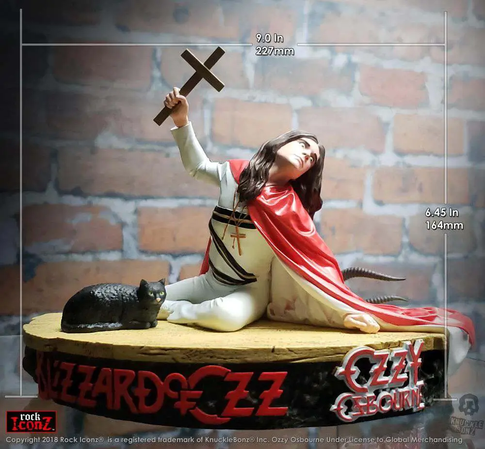 All Rock Iconz statues are hand-crafted. This is a fine-arts process where each statue is hand-cast, painted and numbered. The Ozzy Osbourne Rock Iconz statue is officially licensed. There are only 3000 created and sold worldwide. These statues are created in 1/9 scale, making the average height of each approximately 8.5” tall and each statue comes with a certificate of authenticity on the base of the statue. Ozzy’s Rock Iconz design is 6.45 inches tall and 9 inches wide.