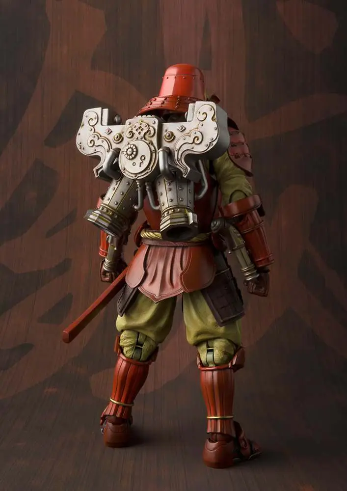 The popular Meisho MANGA REALIZATION series re-envisions hit characters as samurai of old. The second release is Iron Man Mark 3, as envisioned by the talented Takayuki Takeya. Iron Man’s high-tech armor is rendered as ancient samurai armor, with details down to the ornate scroll-work on the breastplate and rivets on the plating. Clockwork, steam-punk style jetpack and flintlock rifle-esque cannons enhance the fantastic atmosphere of the design. The 180mm figure comes with two types of optional hands (left and right sides), a katana, and a jetpack.