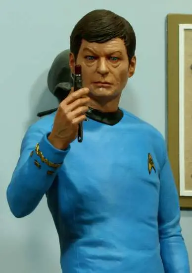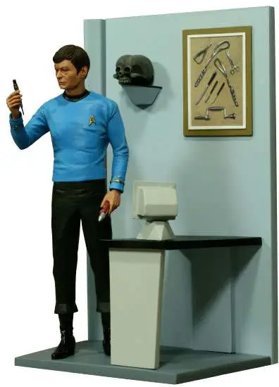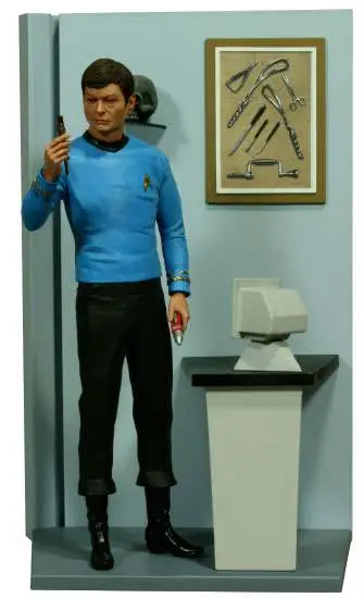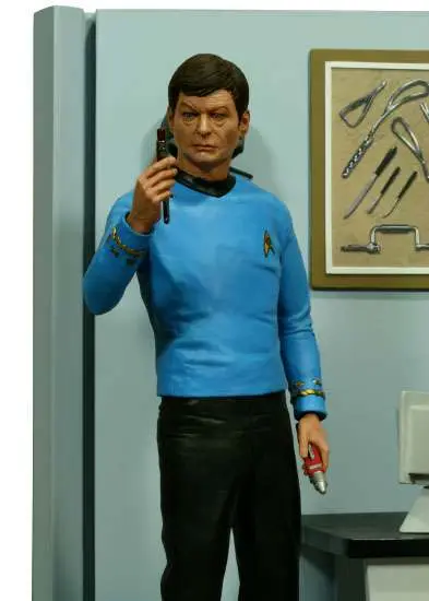Hollywood Collectibles is proud to present Leonard "Bones" McCoy, Chief Medical Officer of U.S.S. Enterprise NCC-1701, standing by his desk in the medical bay. Featuring an authentic likeness of DeForest Kelley in character as McCoy, and a highly detailed replica of his medical bay office, this is a must have for any Star Trek fan! Sculpted in 1:6 scale, McCoy stands 12" tall, with the overall height of the diorama being 14½". This incredible piece of art is constructed from heavyweight polystone and then hand painted to the finest detail. Limited to just 600 pieces worldwide!