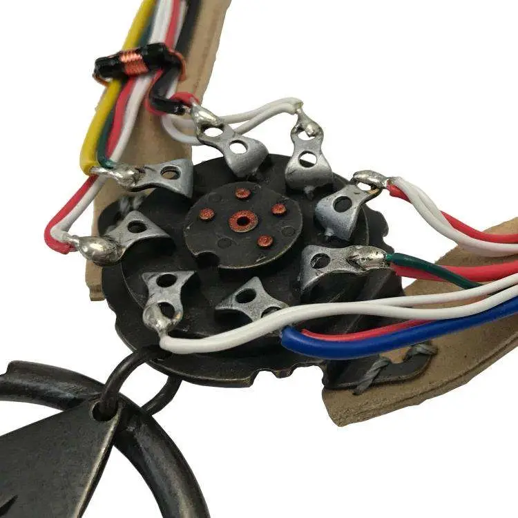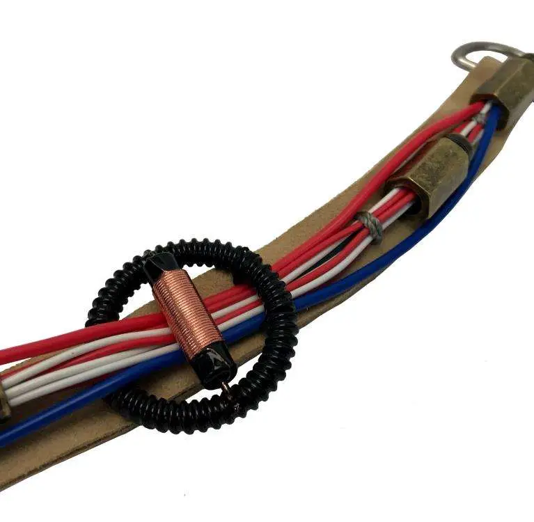 Due to the rarity and, in some cases, the fragility of actual vintage electrical components, these parts were recreated in solid metal. Each replica features real electrical wire of the correct gauge and color. All parts were then hand-stitched to an imitation-suede band, exactly like the original props.
