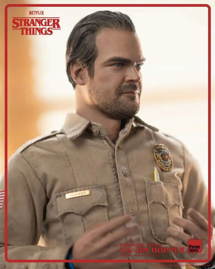 The Stranger Things – 1/6 Jim Hopper collectible figure stands approximately 12.5” (31.8cm) tall features a fully-articulated 1/6 original body with approximately 35 points of articulation. This collectible figure showcases precisely sculpted details and weathering effects, effectively capturing the powerful and tough presence of Jim Hopper.