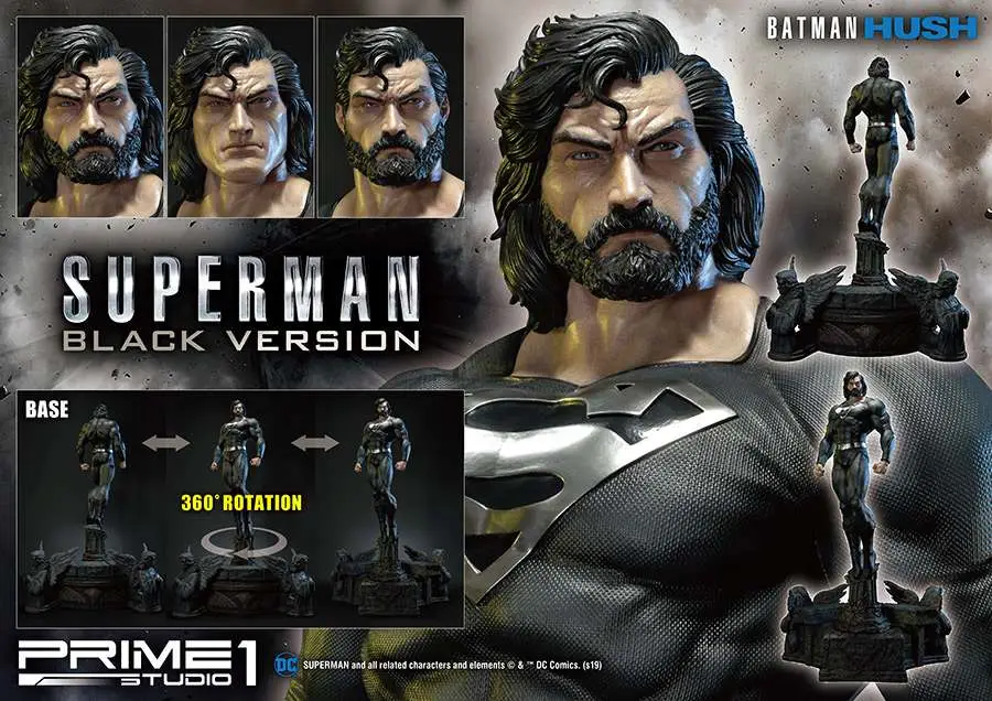 This is the Black Suit Version of Superman, without his iconic Red and Blue costume. There are three alternate heads to choose from to display: Long hair, Long Hair with beard and Short hair with beard.