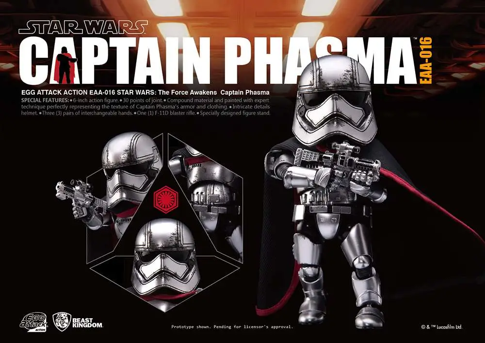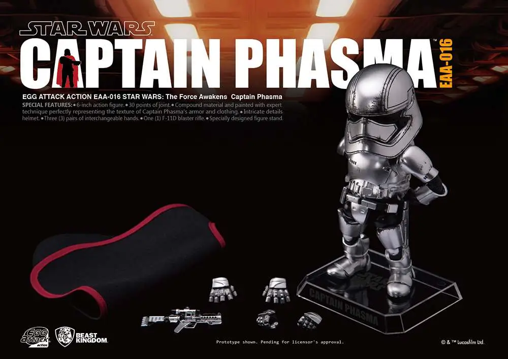 Beast Kingdom is proud to present the Egg Attack Action Star Wars Series’ Captain Phasma from Star Wars: The Force Awakens. The 6–inch action figure is specially crafted based on Captain Phasma’s character and painted with expert technique, perfectly representing the texture of her silver armor and helmet with weathering effects. The figure, with over 30 points of joint, also features finely tailored cape, highly detailed F-11D blaster rifle, and a specially designed figure stand.
