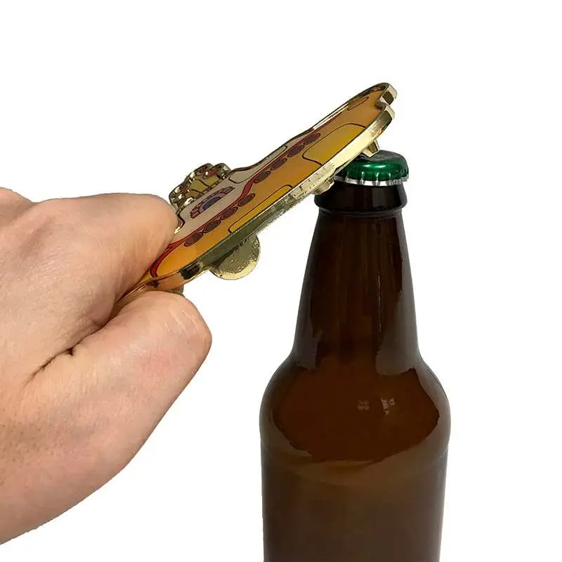 High quality, heavy duty metal bottle opener featuring artwork of the Yellow Submarine in a glossy enamel finish on the front and a magnet and stand on the back for multiple display purposes.