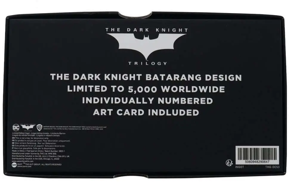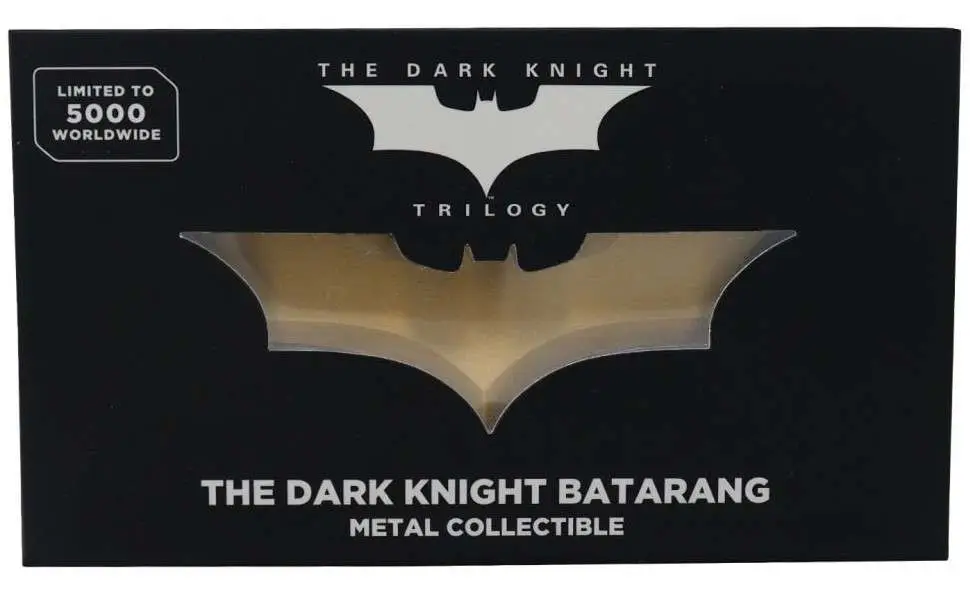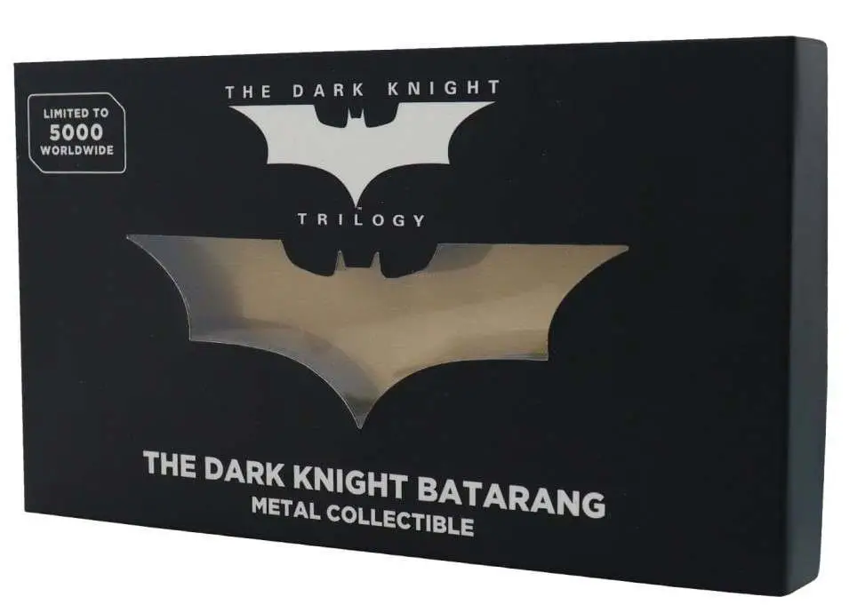 A Replica of the Batarang used by Batman in the Nolan's movie, The Dark Knight, limited to only 5,000 worldwide and individually numbered. The presentation box includes an art card and an internal display stand.