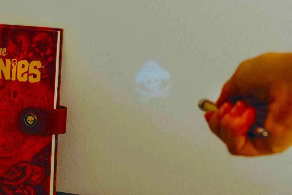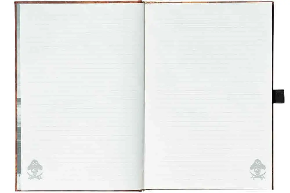 This A5 notebook (14.8 x 21cm) features a durable hard cover, rounded edges and a snap closure to keep its interior safe. Embossed details with gold trim. 192 pages of premium quality 100gsm paper. Includes a pen with light projecting One-Eyed Willie's Jolly Roger!