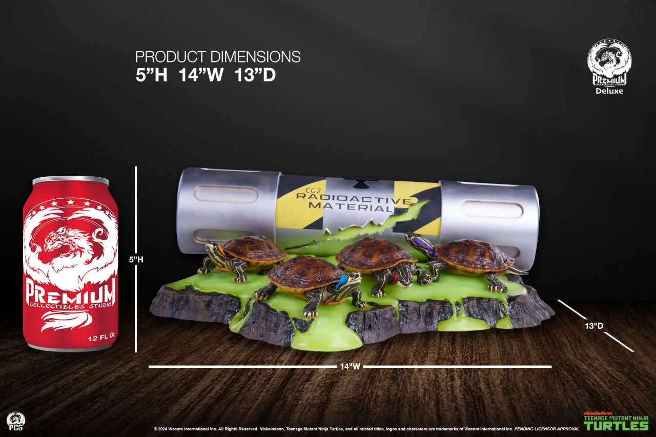 The TMNT: Origins Diorama is a fully sculpted collectible that measures 5"H x 14"W x 13"D recreating the moment young Leonardo, Raphael, Michelangelo and Donatello came in contact with the bright green ooze that would transform them into the Teenage Mutant Ninja Turtles.
