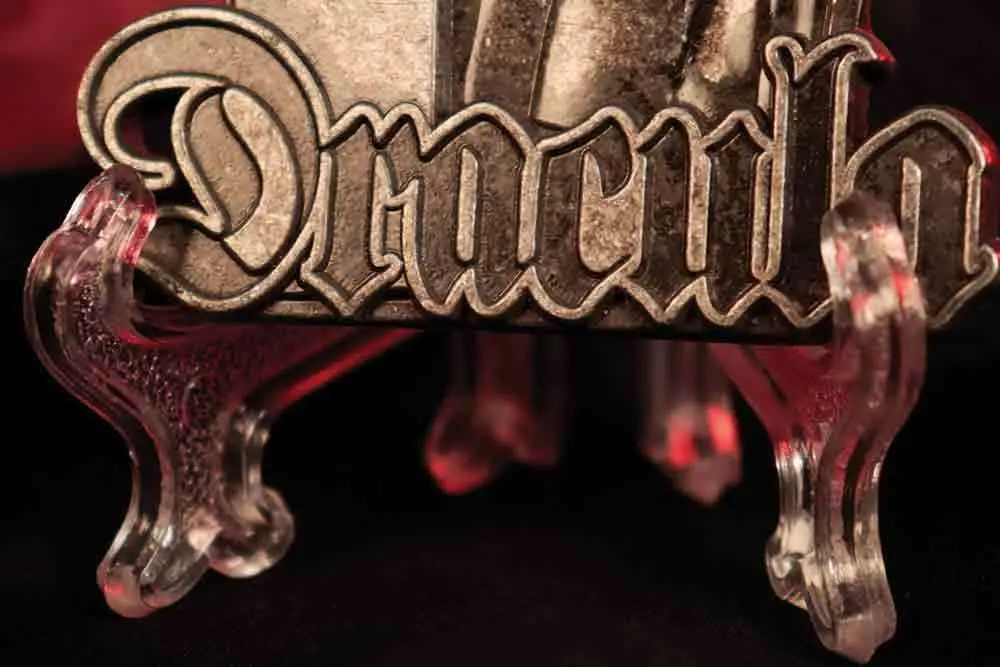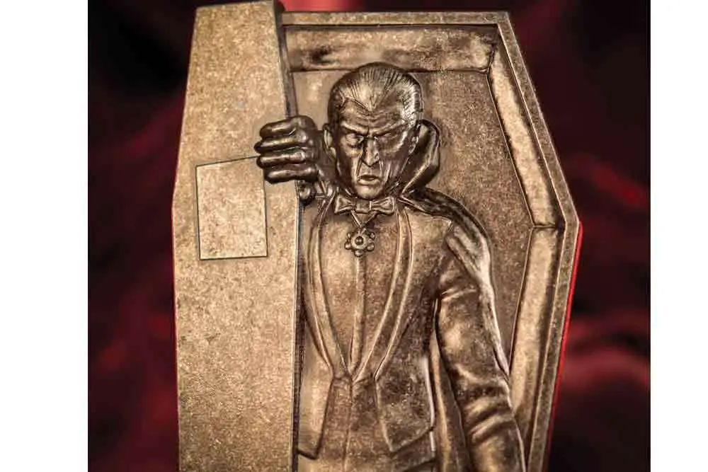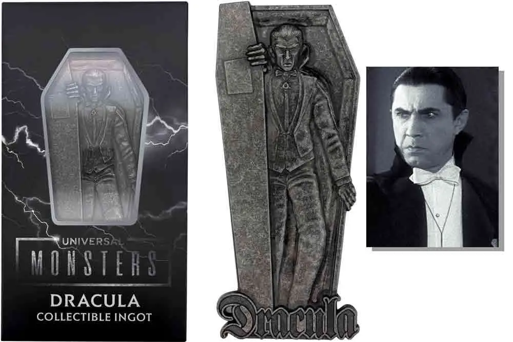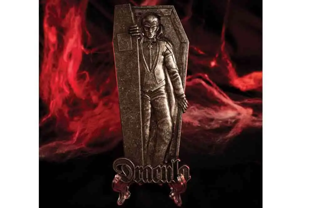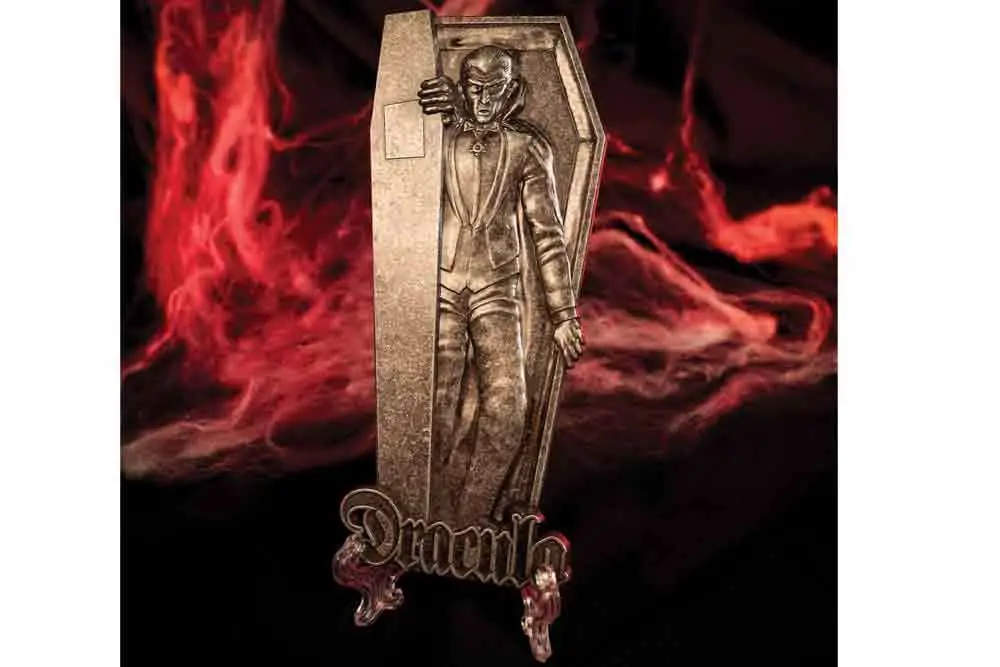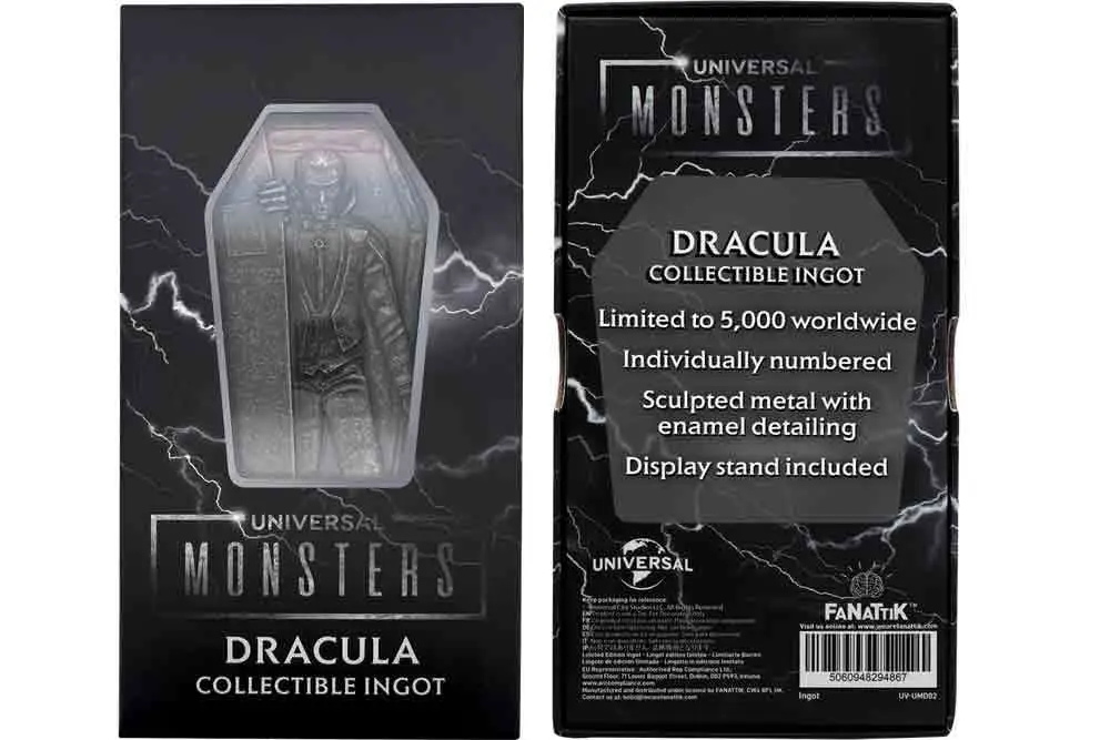 This limited edition metal ingot with coloured enamel celebrating the Count of Transylvania measures 130 x 55.5mm and is individually numbered on the reverse as one of 5,000. Each ingot comes in a presentation box with an acrylic stand.