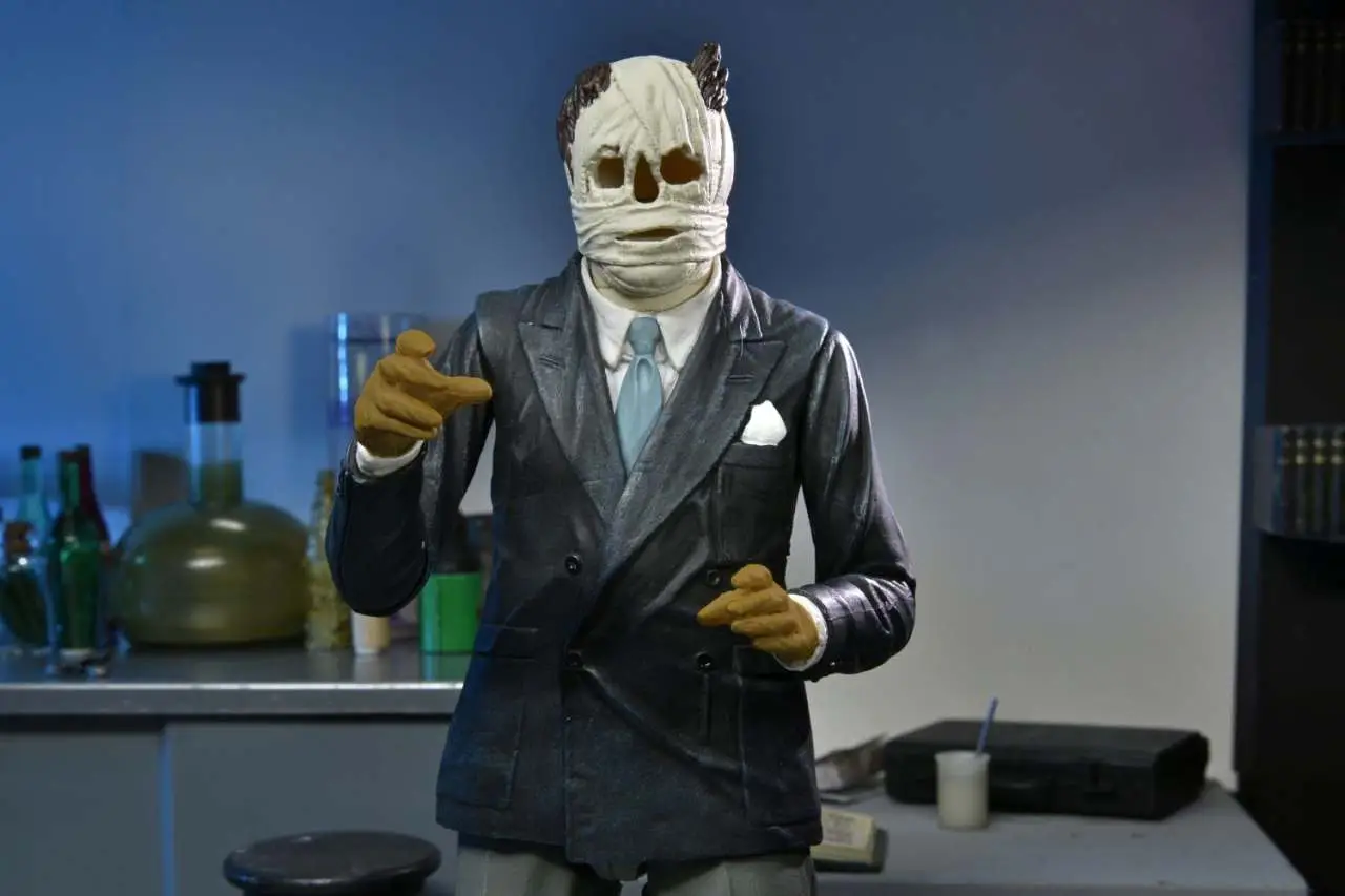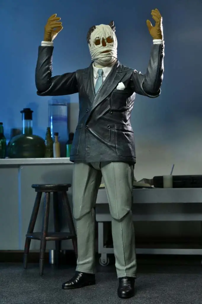 For the 90th anniversary of Universal's sci-fi horror film classic, NECA is excited to reveal The Invisible Man in Ultimate action figure form! Starring Claude Rains, 1933's The Invisible Man was based on the classic H.G. Wells novel and received critical acclaim, eventually being placed on the U.S. National Film Registry for its historical significance. The interchangeable heads capture the seemingly solid wrapped version as well as partially uncovered versions with peeks at the insane emptiness within. Also included are interchangeable wrapped and gloved hands, goggles, nose, notebook, wig, and cup with straw. The figure stands in 7” scale and comes in display-friendly window box packaging with opening front flap.